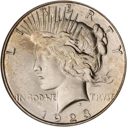 <b>1923-S Peace Dollar. NGC graded MS65.</b> A nearly pristine example of this difficult date, the fields being matte and lustrous, bright white, the designs almost free of contact marks and well featured. Soft-edged devices and lettering throughout the centers, seem to be the rule with 1923-S; only a small percentage of this year's production is found with enough convincing detail to be called "bold," but just the same this is squarely within the Gem class, and persuasively so <b>(PCGS # 7362)</b>