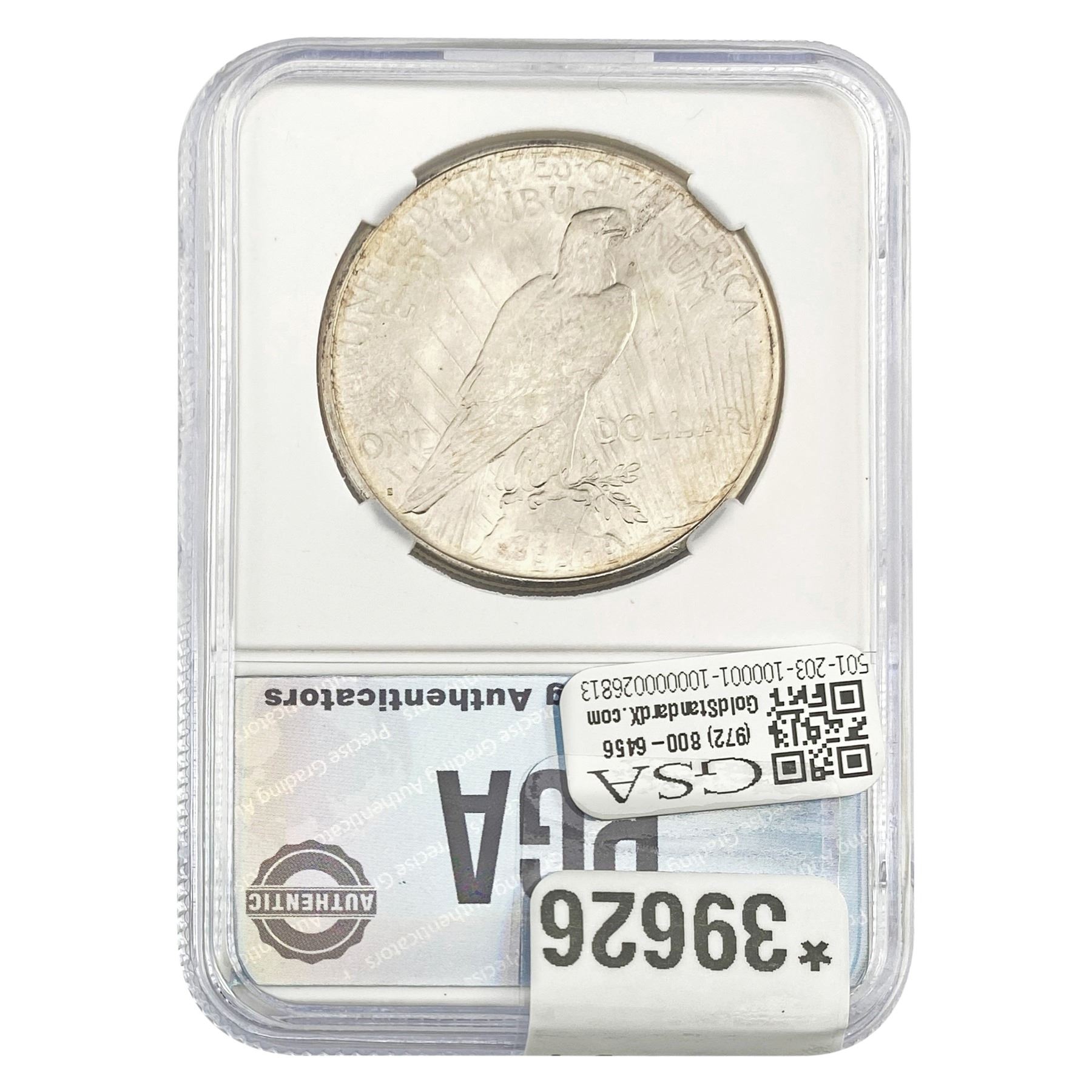 l. All non-certified coins and currency are guaranteed genuine, but are not guaranteed as to grade, since grading is a matter of opinion, an art and not a science, and therefore the description rendered by GSA or any third-party grading service may not agree with the opinion of others (including trained experts), and the same expert may not grade the same item with the same grade at two different times. GSA may, but is not obligated to, express an opinion as to non-certified numismatic items, in GSA’s opinion, or by its employees’ experience and the current interpretation of the American Numismatic Association’s standards as of the date the catalog was prepared. There is no guarantee or warranty expressed or implied that the grading opinions utilized by GSA, if any, will meet the standards of any grading service at any time in the future.