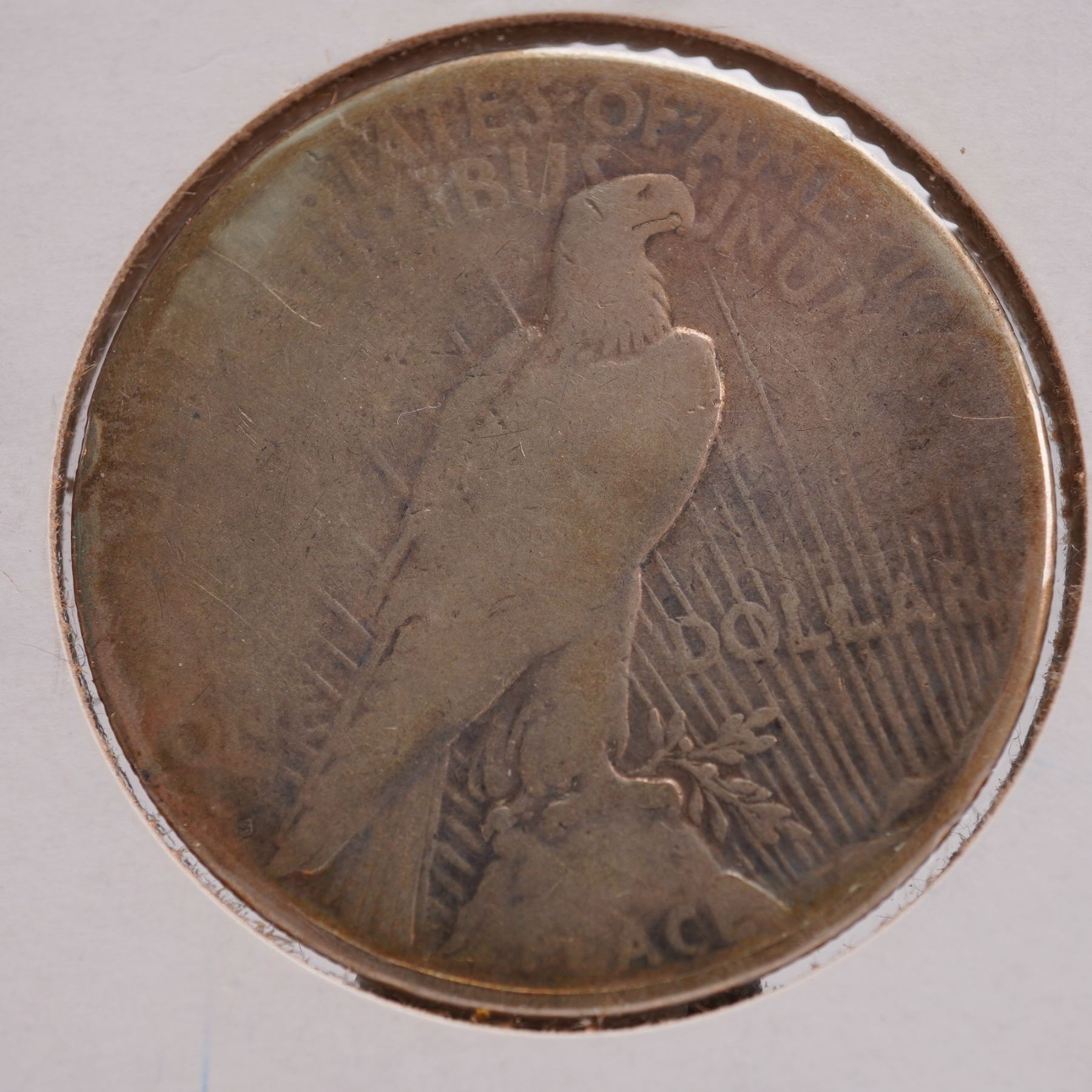 This 1923-S Peace Silver Dollar, minted at the San Francisco Mint and composed of 90% silver and 10% copper. The obverse depicts the dignified left-facing profile of Liberty crowned with radiating spikes symbolizing enlightenment and national pride, encircled with LIBERTY and the classically styled IN GOD WE TRVST, with the date 1923 positioned at the base of the bust. . The reverse displays a majestic eagle perched on a rocky ledge clutching an olive branch, its figure illuminated by the stylized rays of a rising sun, alongside the legends denoting the United States and the coin's denomination. The distinctive "S" mintmark, located beneath the word ONE on the reverse. Enclosed in a cardboard holder. Holder measures: 2"L x 2"H. Coin diameter: 38.1 mm.