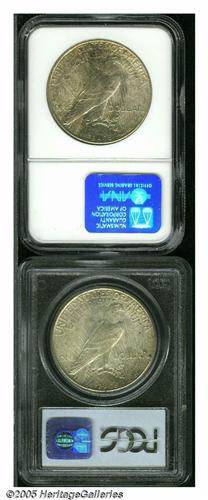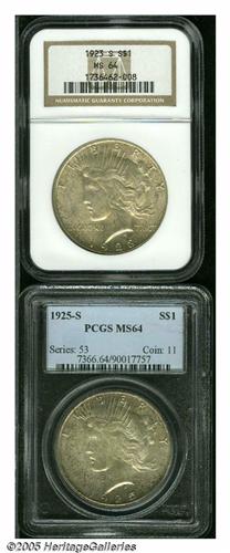 <B>1923-S<S$1> MS64 NGC,</B></I> well struck with satin luster and mottled russet-brown toning on both sides, along with a few small abrasions on the reverse; and a <B>1925-S MS64 PCGS,</B></I> softly struck over the centers, with mottled, multicolored patina and a few minor surface blemishes on obverse and reverse.
