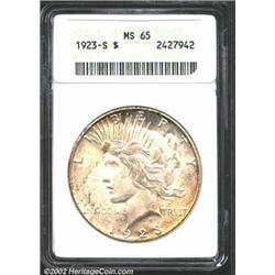 1923-S S$1 MS65 ANACS. Much better defined than the usually seen 1923-S Dollar with strong definition on the eagle's feathers on the reverse. The mint luster is thick and frosted and the heavy abrasions that often plague this issue are absent on this coin. Just the slightest hint of golden-russet color is present around the rims with the interiors brilliant. Important notice: We expect to be auctioning lots at the rate of 200-250 per hour. Sometimes eBay Premier live bid software cannot keep up with that pace, so we strongly recommend that you place a realistic proxy bid now as insurance to avoid disappointment. Also please note that all Heritage/CAA lots purchased through eBay Premier carry a 20% Buyer's Premium. Please make sure you read the Terms and Conditions.