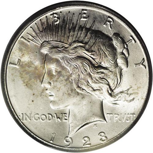<B>1923-S<img border='0' src='http://www.heritagecoins.com/images/star.gif' width=10 height=10>$1> MS65 PCGS.</B></I> Creamy, refreshingly unmarked surfaces with coppery-gold and lilac central accents on the obverse. One of the more conditionally elusive Peace dollar issues, being surprisingly scarce as a Gem despite a production of more than 19 million pieces. Population: 81 in 65, 3 finer (4/06).
