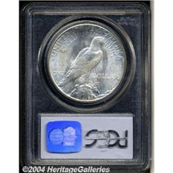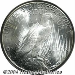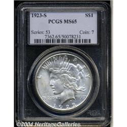 <B>1923-S<S$1> MS65 PCGS.</B></I> A splendid Gem that has far above average design definition. The typical '23-S dollar is extremely weak. The surfaces of this lovely dollar are frosty with brilliant luster. There are few imperfections of any sort. A couple tiny abrasions are visible on Liberty's cheek, however, they are barely noticeable and should certainly not be called bagmarks. Only three finer examples have been certified. Population: 61 in 65, 3 finer (3/04). <BR><BR><B>Important notice:</B> Heritage usually auctions material at the rate of 200-250 lots per hour. On some occasions eBay Live bid software or the Internet may not be able to keep up with the pace of the auction. We recommend placing a realistic absentee bid now as insurance to avoid disappointment. Occasionally the auctioneer may eliminate or reject an eBay Live bid, and the auctioneer may also reopen a lot after the close of the eBay live bidding (usually because we missed an audience bid), and may reject your bid even if it shows you as the winning bidder. By bidding via eBay Live, you agree that Heritage may award the lot to another bidder at its sole discretion under the circumstances described above or any other reasonable circumstances. Since eBay bids are not shown to us until we open the lot on the floor, we treat those bids just like floor bids. In most cases the floor responds before the eBay bid is presented to us, due to Internet lag time, so for consistency we have made it a policy that floor bids are always considered first over tie eBay live bids. Also please note that all Heritage lots purchased through eBay Live carry a 20% Buyer's Premium. Please make sure you read the Terms and Conditions before you bid. </span></font></tr></table></td></tr></table>