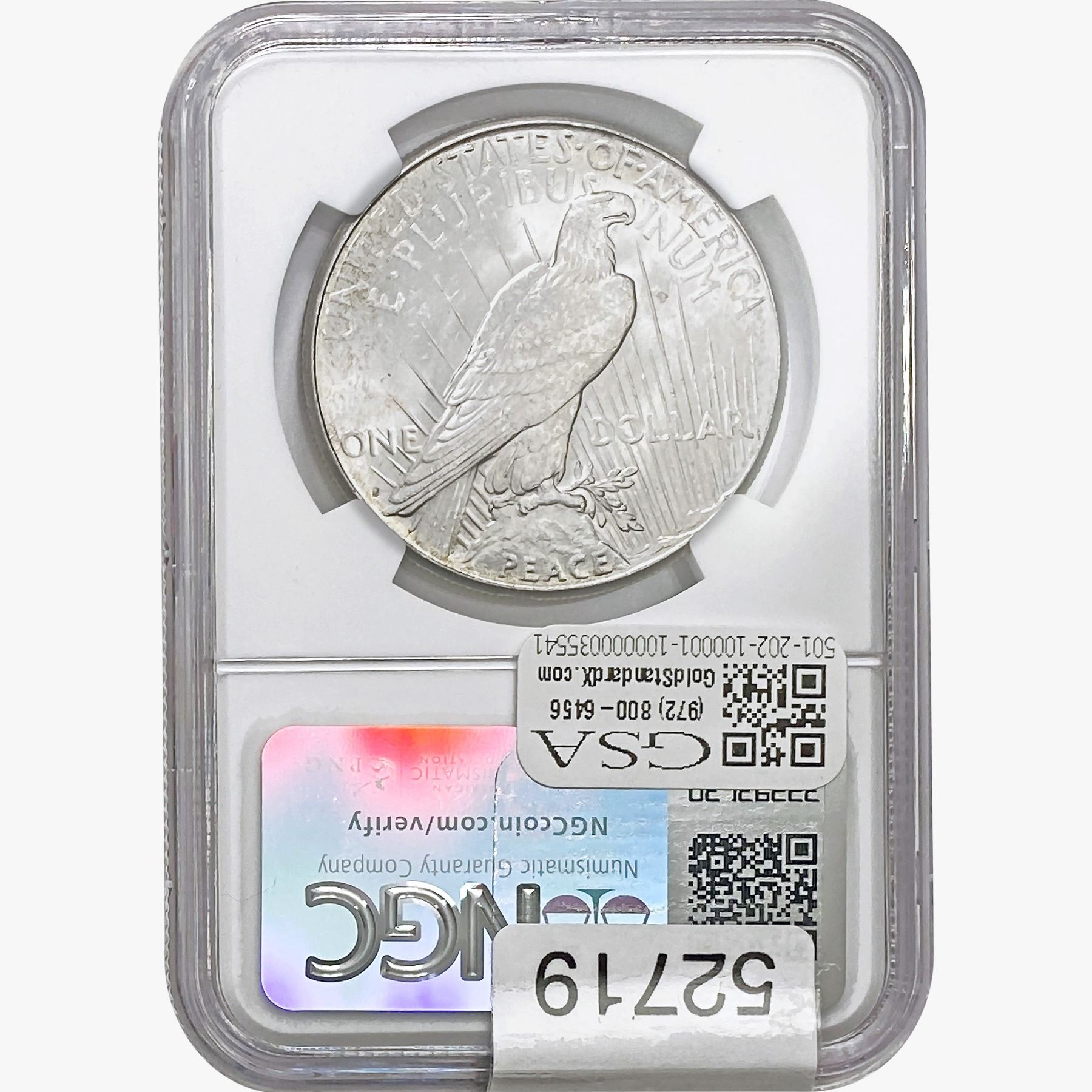 e. Coins sold referencing a third-party grading service are sold “AS IS” without any express or implied warranty, except for a guarantee by GSA that they are genuine. Removal or alteration of the holder, voids all of Bidder’s claims concerning that Product. Certain warranties may be available from the grading services and Bidders are referred to them for further details: Numismatic Guaranty Corporation (NGC), PO Box 4776, Sarasota, FL 34230, www.ngccoin.com/services/writtenguarantee.asp; Professional Coin Grading Services (PCGS), PO Box 9458, Newport Beach, CA 92658, www.pcgs.com/guarantee.html; ANACS, 6555 S. Kenton St., Ste. 303, Englewood, CO 80111; and Independent Coin Grading Co. (ICG), 7901 East Bellview, Ave., Suite 50, Englewood, CO 80111.