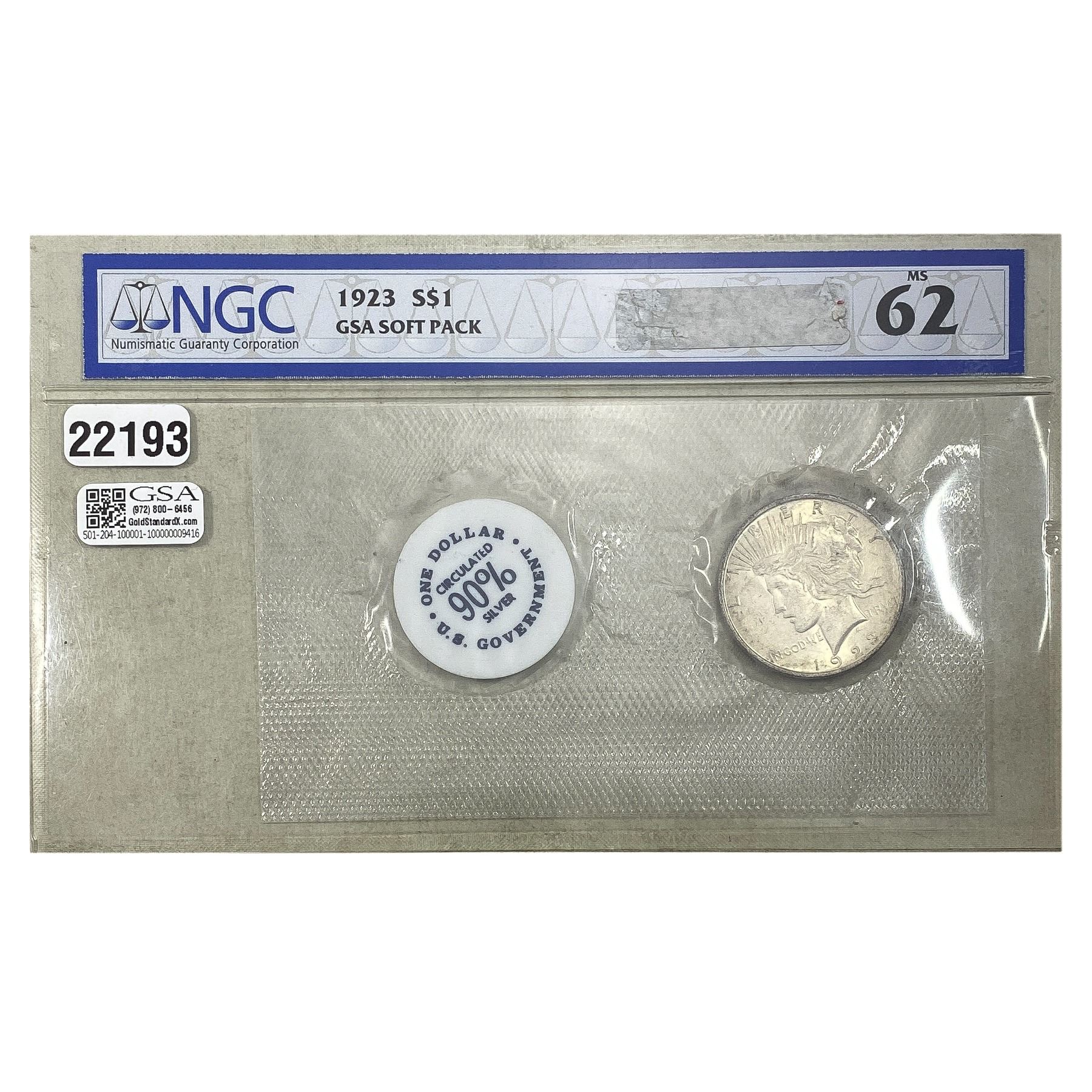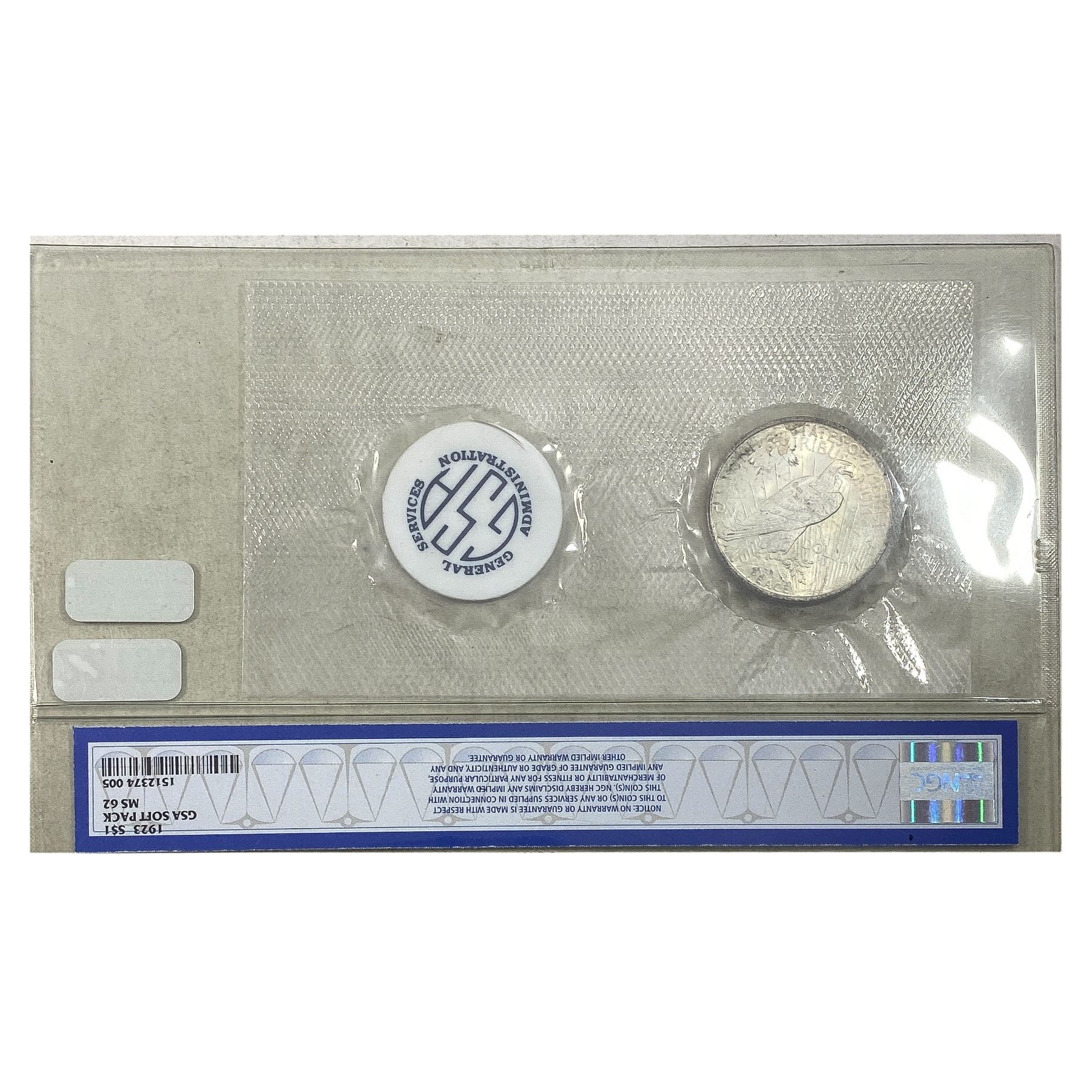 1923 Silver Peace Dollar GSA Soft Pack NGC MS62