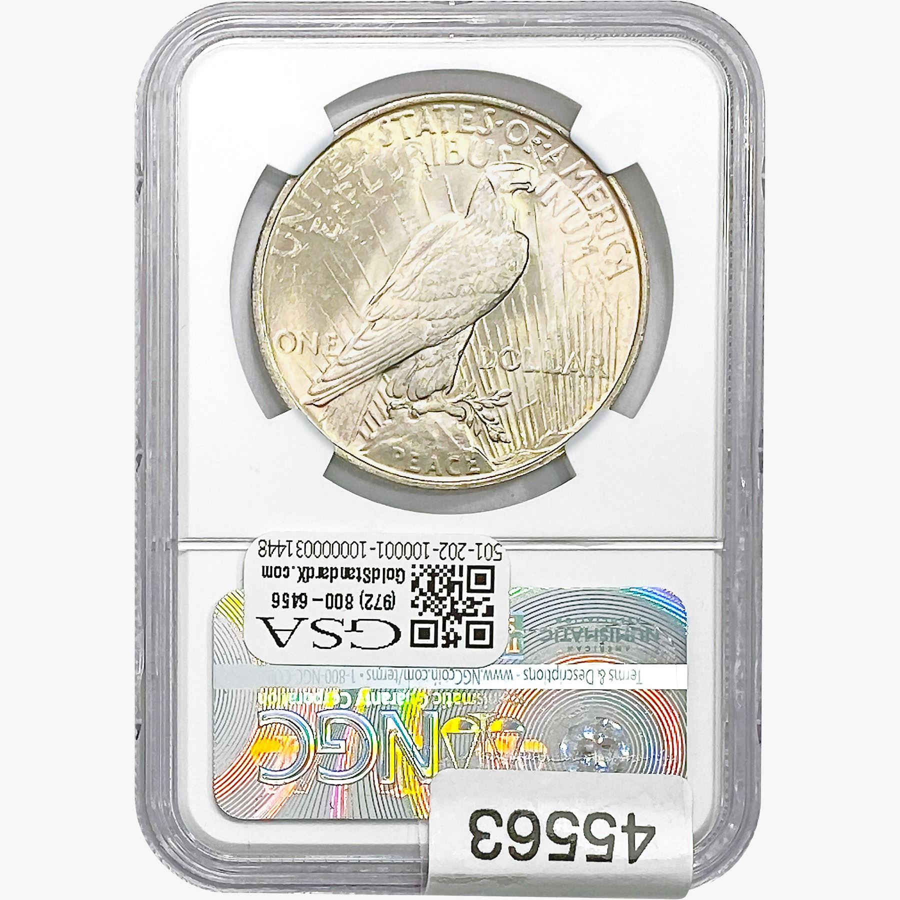 e. Coins sold referencing a third-party grading service are sold “AS IS” without any express or implied warranty, except for a guarantee by GSA that they are genuine. Removal or alteration of the holder, voids all of Bidder’s claims concerning that Product. Certain warranties may be available from the grading services and Bidders are referred to them for further details: Numismatic Guaranty Corporation (NGC), PO Box 4776, Sarasota, FL 34230, www.ngccoin.com/services/writtenguarantee.asp; Professional Coin Grading Services (PCGS), PO Box 9458, Newport Beach, CA 92658, www.pcgs.com/guarantee.html; ANACS, 6555 S. Kenton St., Ste. 303, Englewood, CO 80111; and Independent Coin Grading Co. (ICG), 7901 East Bellview, Ave., Suite 50, Englewood, CO 80111.