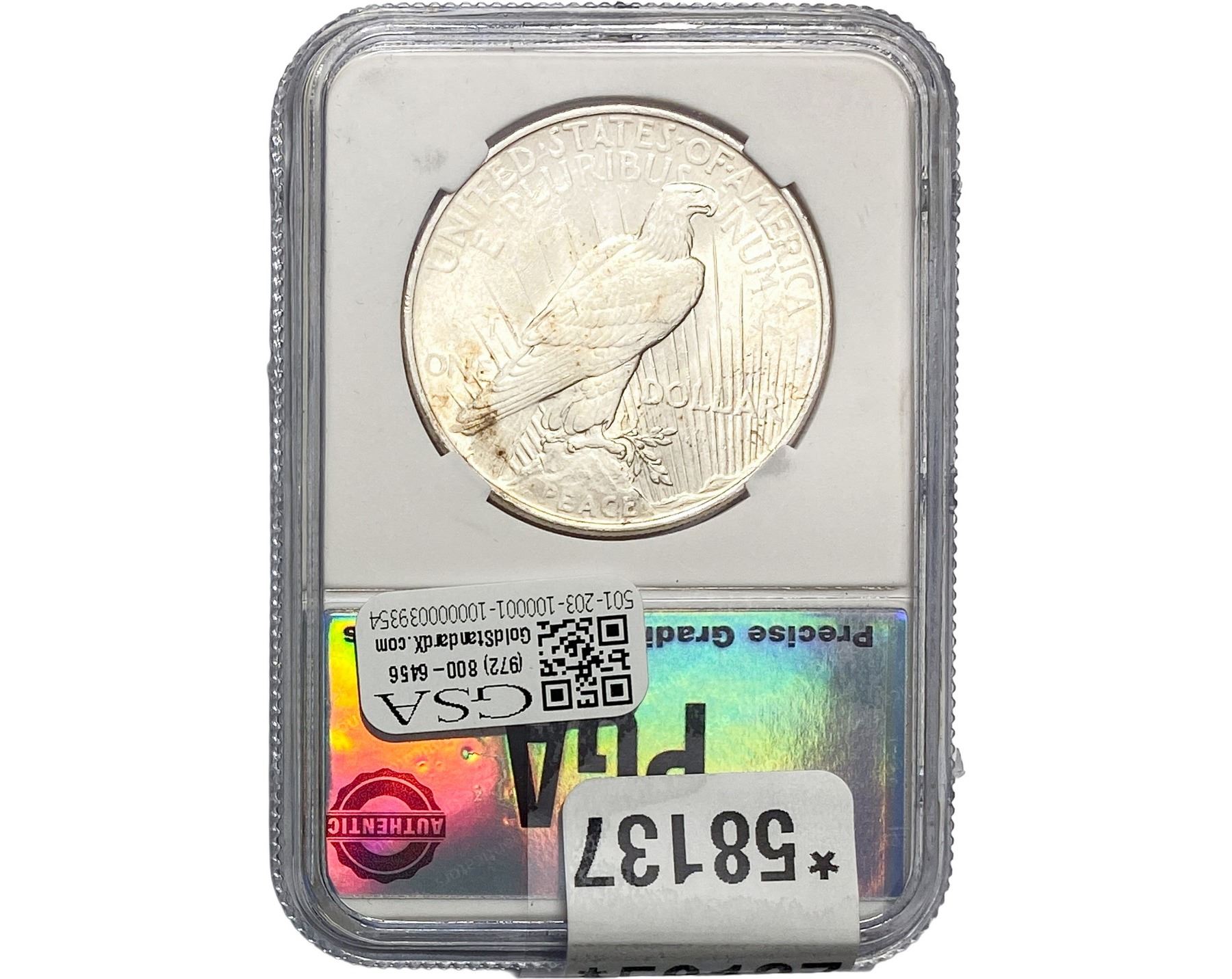 e. Coins sold referencing a third-party grading service are sold “AS IS” without any express or implied warranty, except for a guarantee by GSA that they are genuine. Removal or alteration of the holder, voids all of Bidder’s claims concerning that Product. Certain warranties may be available from the grading services and Bidders are referred to them for further details: Numismatic Guaranty Corporation (NGC), PO Box 4776, Sarasota, FL 34230, www.ngccoin.com/services/writtenguarantee.asp; Professional Coin Grading Services (PCGS), PO Box 9458, Newport Beach, CA 92658, www.pcgs.com/guarantee.html; ANACS, 6555 S. Kenton St., Ste. 303, Englewood, CO 80111; and Independent Coin Grading Co. (ICG), 7901 East Bellview, Ave., Suite 50, Englewood, CO 80111.