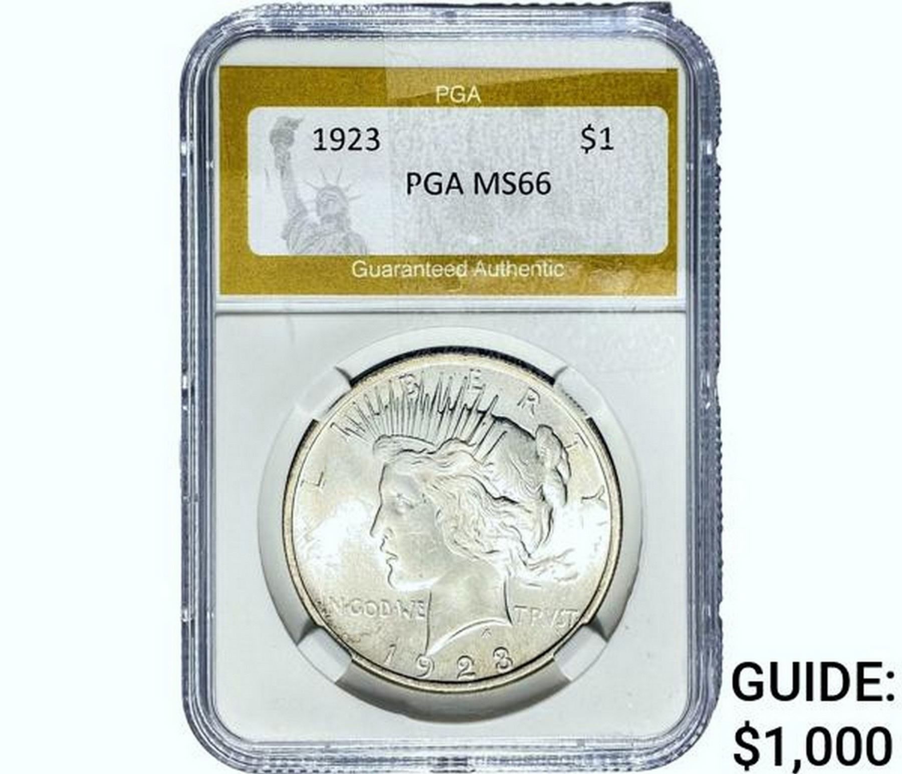 COINS AND CURRENCY LISTED IN GSA’S CATALOG AS GRADED AND ENCAPSULATED BY PCGS, NGC, ANACS, ICG, PCGS CURRENCY, PMG, PCGS BANKNOTE GRADING, CMC OR ANY OTHER THIRD-PARTY GRADING SERVICE ARE LIKEWISE SOLD “AS-IS” EXCEPT AS EXPRESSLY SET FORTH HEREIN. ALL THIRD-PARTY GRADING SERVICE GUARANTEES, INCLUDING AUTHENTICITY, ARE THE SOLE RESPONSIBILITY OF THE THIRD-PARTY GRADING SERVICE AND NOT WARRANTIES OR GUARANTEES OF GSA. BIDDERS SHOULD CONTACT THESE THIRD-PARTY GRADING SERVICES DIRECTLY WITH RESPECT TO ANY CLAIMS OR QUESTIONS THEY MAY HAVE CONCERNING THEIR GUARANTEES AND WARRANTIES. BIDDERS ACKNOWLEDGE AND AGREE THAT AUCTIONEER IS NOT BOUND BY OR LIABLE FOR ANY OPINION OR CERTIFICATION BY ANY THIRD-PARTY GRADING SERVICE. REMOVAL OF A PRODUCT FROM ITS PROTECTIVE CASING OR HOLDER OR ALTERATION OF ANY COIN HOLDER WAIVES ALL RIGHTS CONCERNING THE PRODUCT CONTAINED THEREIN.