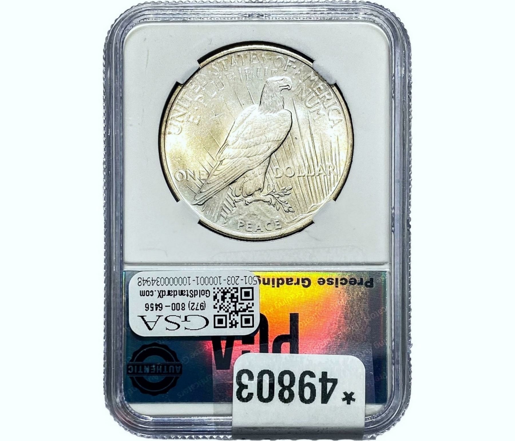 l. All non-certified coins and currency are guaranteed genuine, but are not guaranteed as to grade, since grading is a matter of opinion, an art and not a science, and therefore the description rendered by GSA or any third-party grading service may not agree with the opinion of others (including trained experts), and the same expert may not grade the same item with the same grade at two different times. GSA may, but is not obligated to, express an opinion as to non-certified numismatic items, in GSA’s opinion, or by its employees’ experience and the current interpretation of the American Numismatic Association’s standards as of the date the catalog was prepared. There is no guarantee or warranty expressed or implied that the grading opinions utilized by GSA, if any, will meet the standards of any grading service at any time in the future.