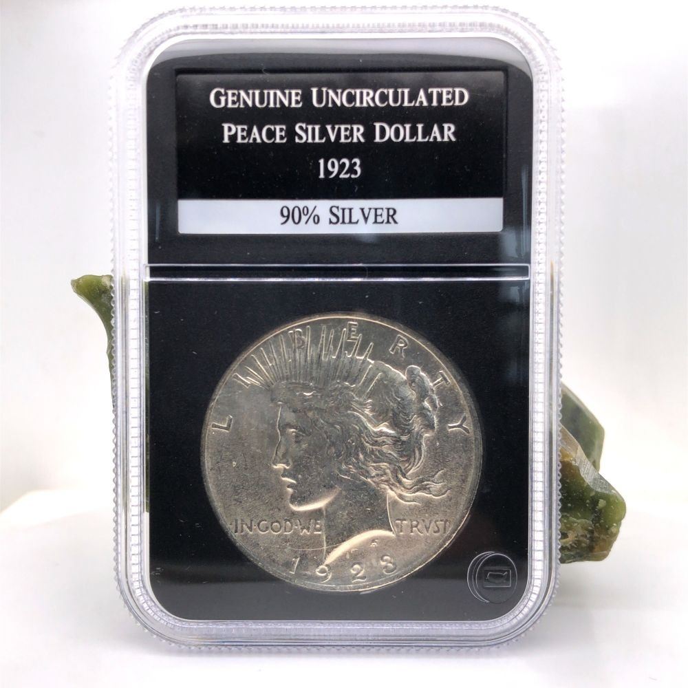This encapsulated silver peace dollar was minted in 1923& nbsp; at the Philadelphia mint.& nbsp;