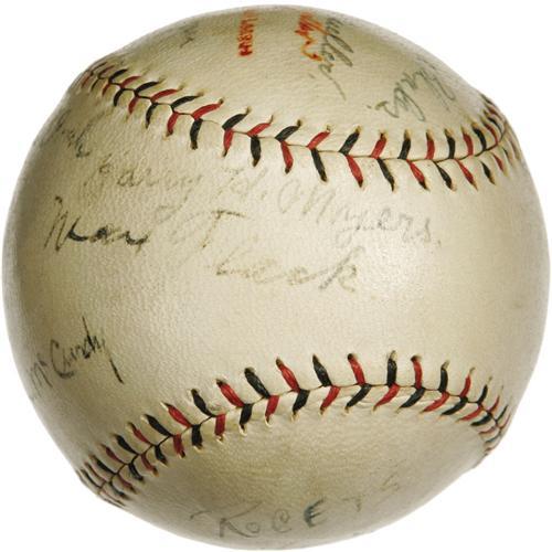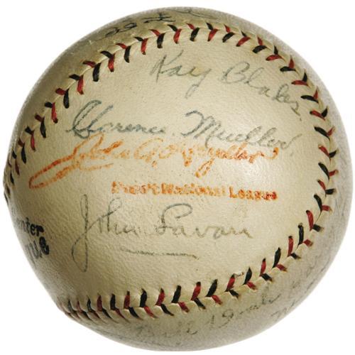 <B>1923 St. Louis Cardinals Team Signed Baseball.</B></I> Tough team sphere boasts remarkable condition for eighty-four years of age, and some top quality names to boot. Best is a solitary side panel Rogers Hornsby, applied in the Hall of Fame second baseman's unusual but well-documented "print" style. The visual effect is that of a highly valuable single signed ball. Also here is the majority of the starting team: Ainsmith, Freigau, Flack, Smith, Myers, Blades and more. Bottomley is present in secretarial format. Twelve signatures in total, averaging a strong 8/10. ONL (Heydler) ball is marvelously clean and provides the ultimate in aesthetic appeal. You'll be hard-pressed to find a 1920's team ball in comparable shape. <I>LOA from PSA/DNA. LOA from James Spence Authentication.</B></I><BR><BR><b>Shipping:</b> Balls, etc. (<a target="_blank" href="http://www.heritageauctions.com/common/shipping.php">view shipping information</a>)