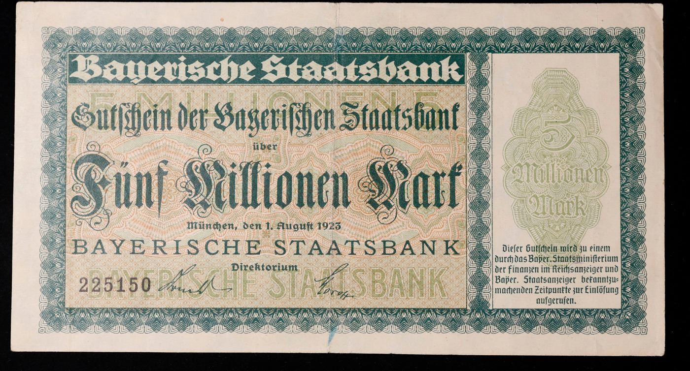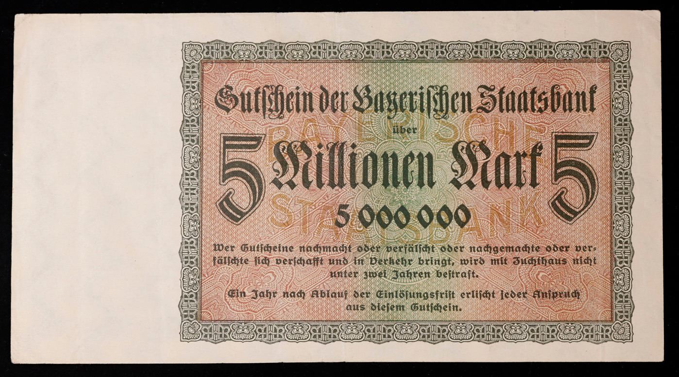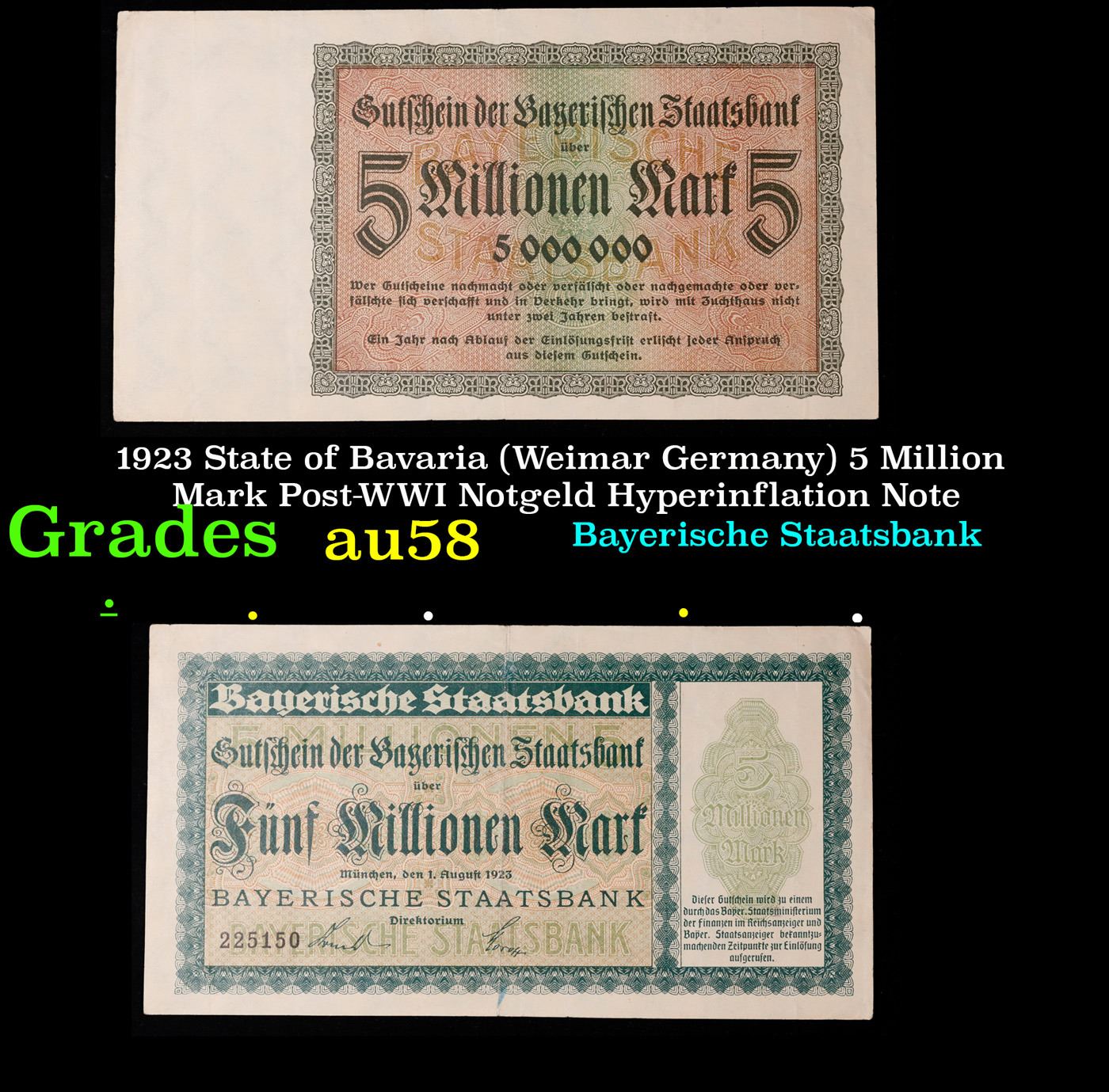 1923 State of Bavaria (Weimar Germany) 5 Million Mark Post-WWI Notgeld Hyperinflation Note Grades Choice AU/BU Slider. Notgeld is German for "emergency/necessity money". Notgeld typically refers to German and Austrian notes produced in the post-WWI period. Somewhat similar to Depression Scrip in the USA, these notes were issued when there wasn'te nough state-produced money available from the central bank. Issuing institutions were often a town's savings banks, municipalities, or private or state-owned firms. Nearly all issues contained an expiry date, after which time they were invalid. Issues without dates ordinarily had an expiry announced in a newspaper or at the place of issuance.