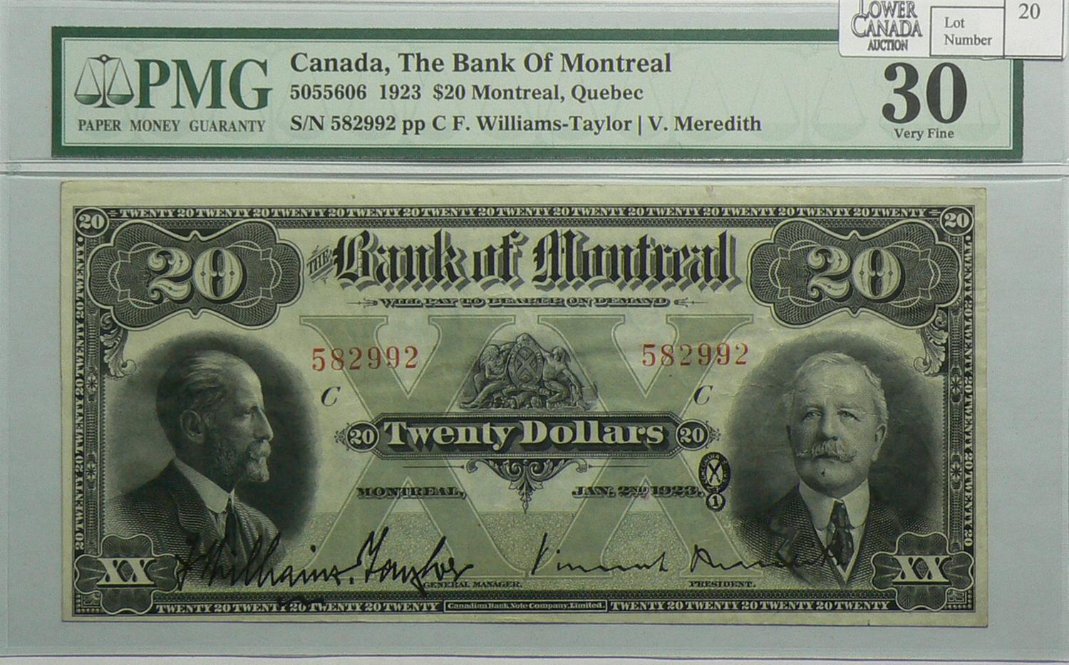 1923 Twenty Dollars Bank of Montreal, 505-56-06, PMG VF-30, William-Taylor Meredith, Letter C, serial 582992.