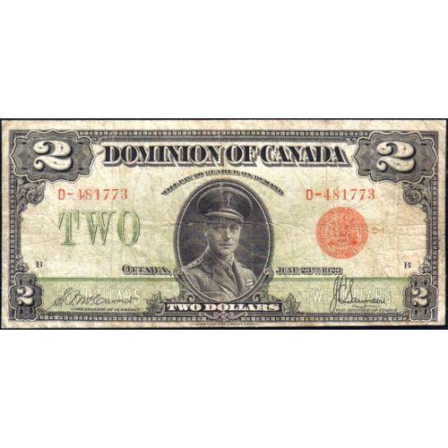 1923 Two Dollars, McCavour-Saunders, Red Seal, Group 1, DC-26b Serial Number D-481773 B, Fine. Some minor staining on the back