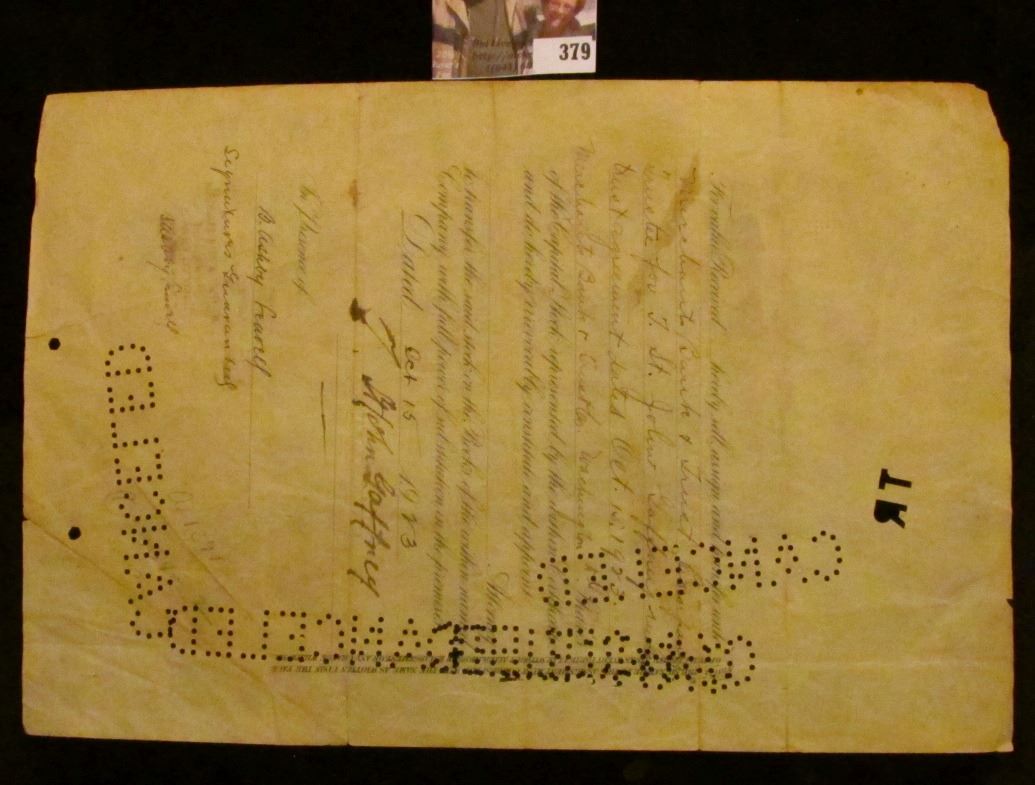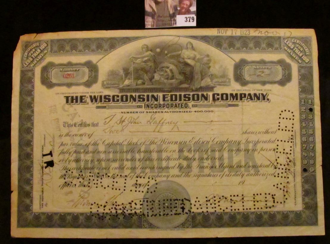 1923 Two Shares of "The Wisconsin Edison Company" Stock Certificate, hole cancelled.