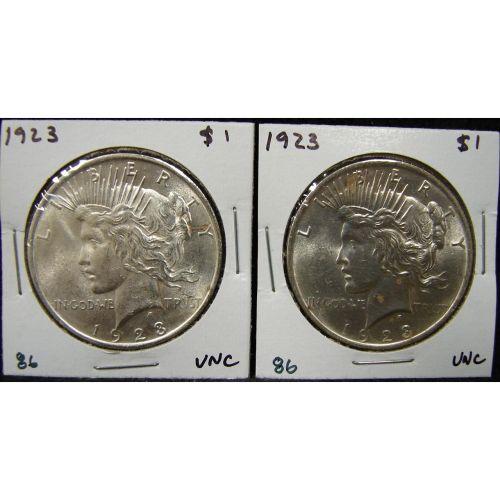 PAIR OF 1923 U.S. PEACE DOLLARS. Unc.
