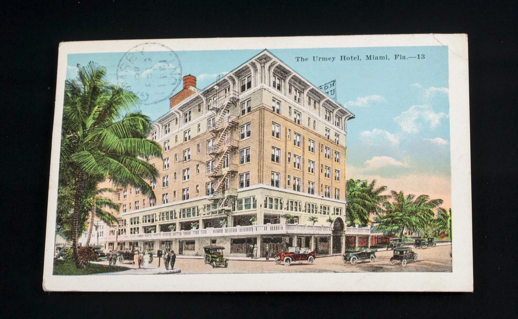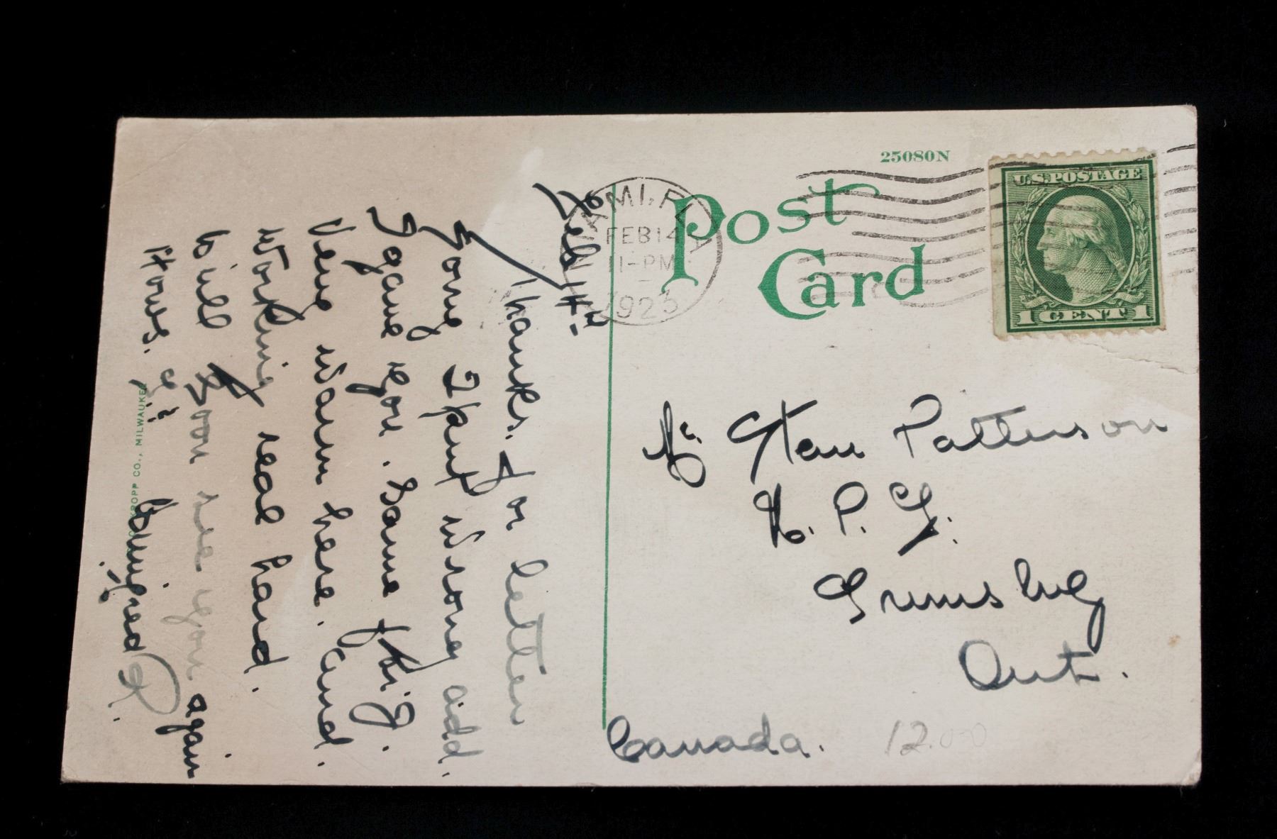 1923 United States Green George Washington 1 cent stamp; with the Urmey Hotel post card; 9 cm x 14 cm
