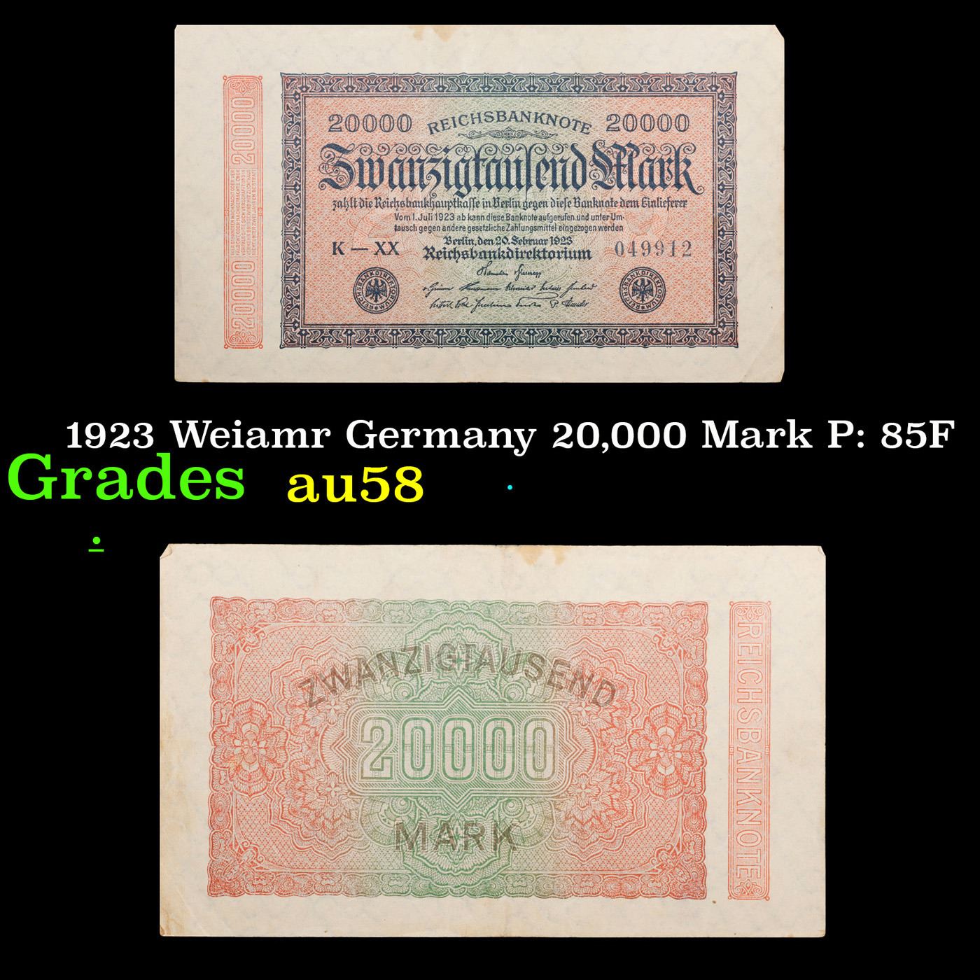1923 Weiamr Germany 20,000 Mark P: 85F Grades Choice AU/BU Slider. In the early 1920s, post-WWI Germany saw its economy spiraling out of control. Hyperinflation started directly after the war in 1918, but truly took over the Weimar Republic from 1921 to 1923. The value of the Mark declined incredibly rapidly. 1 USD was equal to 50 German Marks at the beginning of 1920. Toward the end of 1923, 1 USD was equal to over 4,200,000,000,000 German Marks. At times, denominations of the Mark became less valuable than the paper and labor to print it almost immediately after printing. Thus, denominations of the Mark notes became incredibly large, ending up in the tens of trillions.