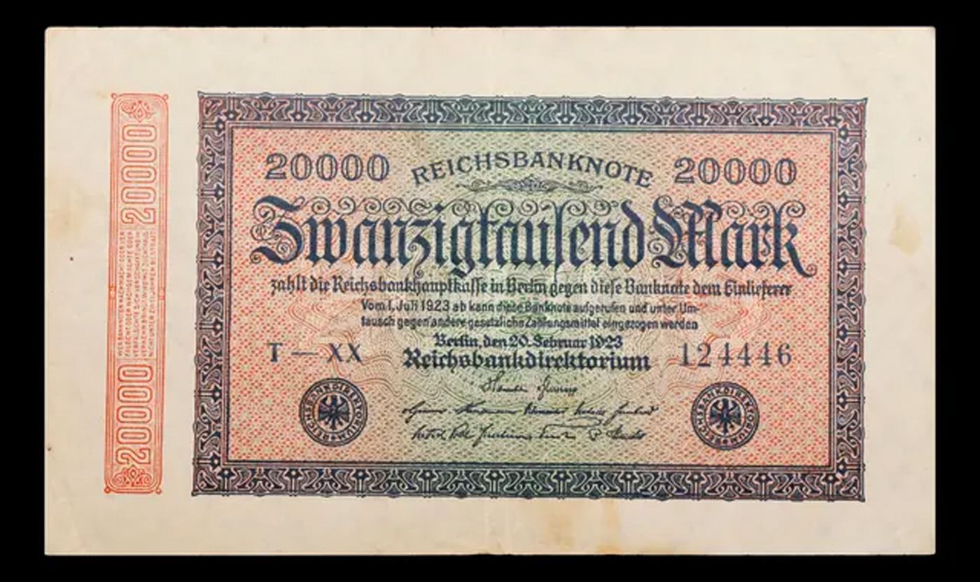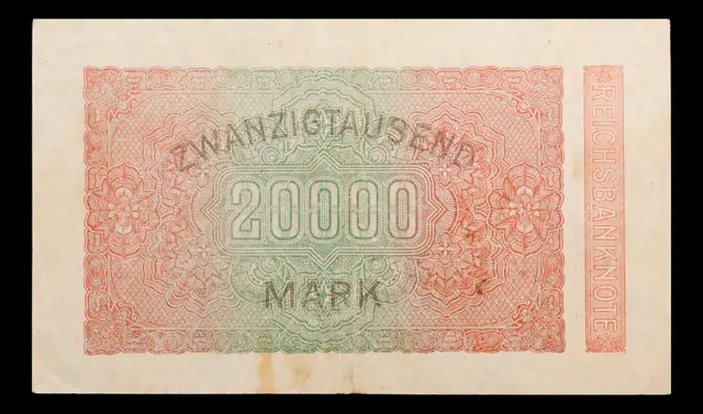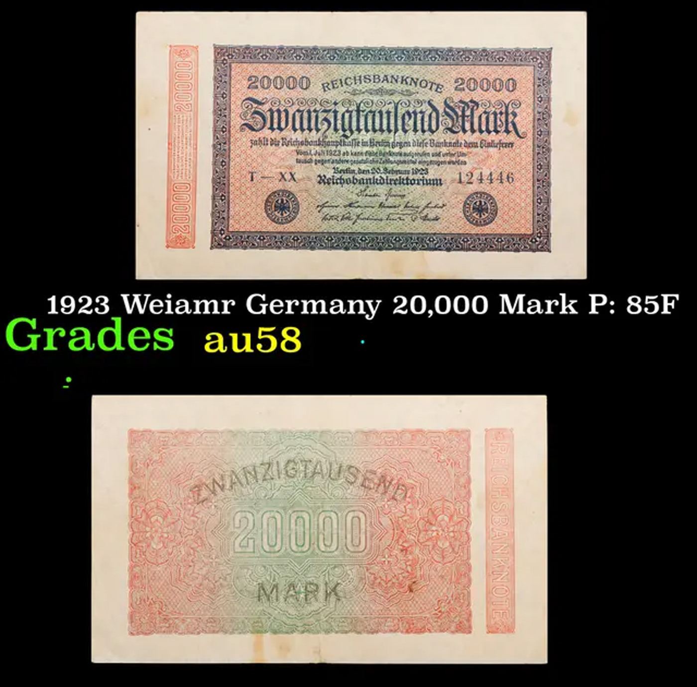 1923 Weiamr Germany 20,000 Mark P: 85F Grades Choice AU/BU Slider. In the early 1920s, post-WWI Germany saw its economy spiraling out of control. Hyperinflation started directly after the war in 1918, but truly took over the Weimar Republic from 1921 to 1923. The value of the Mark declined incredibly rapidly. 1 USD was equal to 50 German Marks at the beginning of 1920. Toward the end of 1923, 1 USD was equal to over 4,200,000,000,000 German Marks. At times, denominations of the Mark became less valuable than the paper and labor to print it almost immediately after printing. Thus, denominations of the Mark notes became incredibly large, ending up in the tens of trillions.