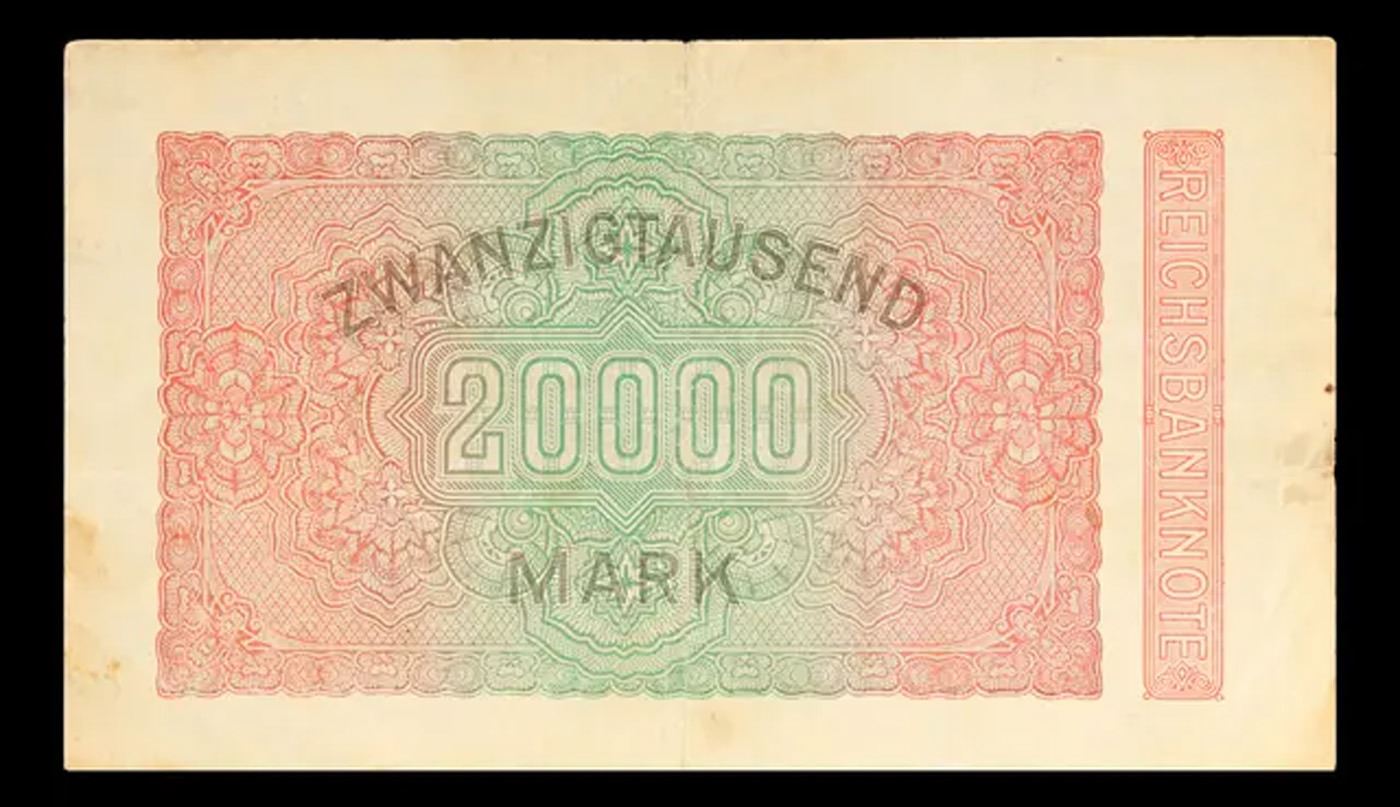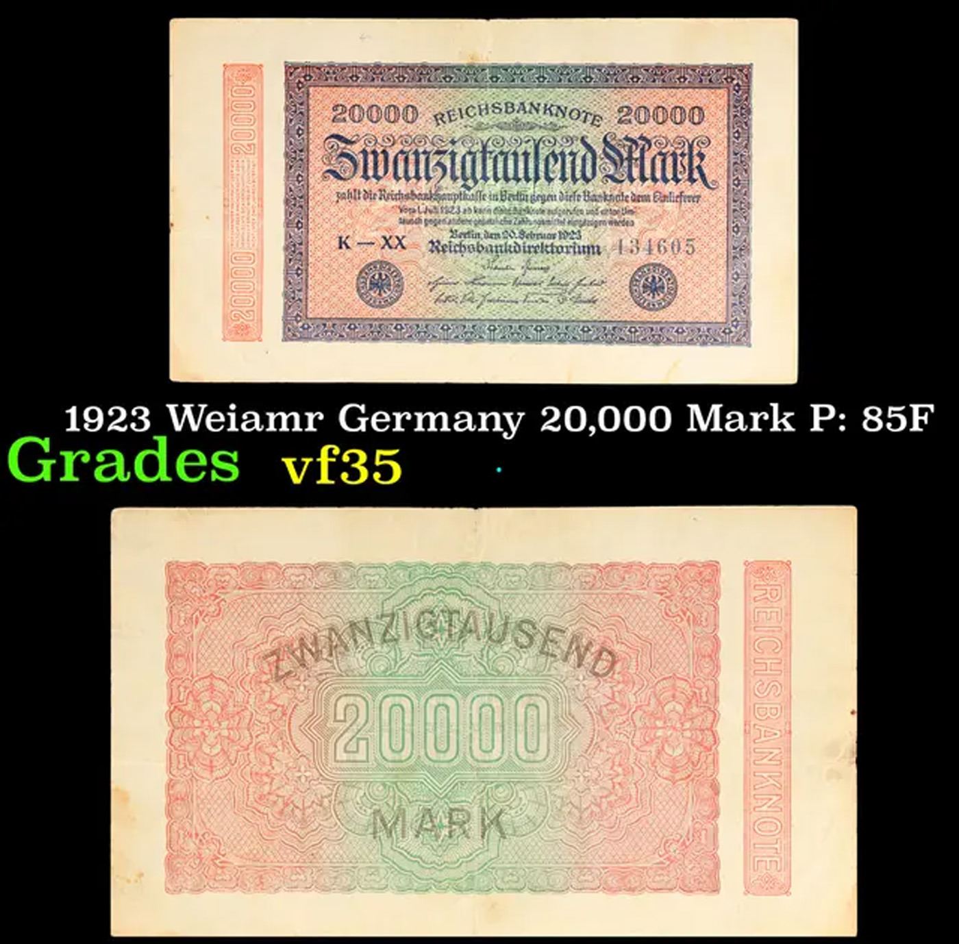 1923 Weiamr Germany 20,000 Mark P: 85F Grades vf++. In the early 1920s, post-WWI Germany saw its economy spiraling out of control. Hyperinflation started directly after the war in 1918, but truly took over the Weimar Republic from 1921 to 1923. The value of the Mark declined incredibly rapidly. 1 USD was equal to 50 German Marks at the beginning of 1920. Toward the end of 1923, 1 USD was equal to over 4,200,000,000,000 German Marks. At times, denominations of the Mark became less valuable than the paper and labor to print it almost immediately after printing. Thus, denominations of the Mark notes became incredibly large, ending up in the tens of trillions.