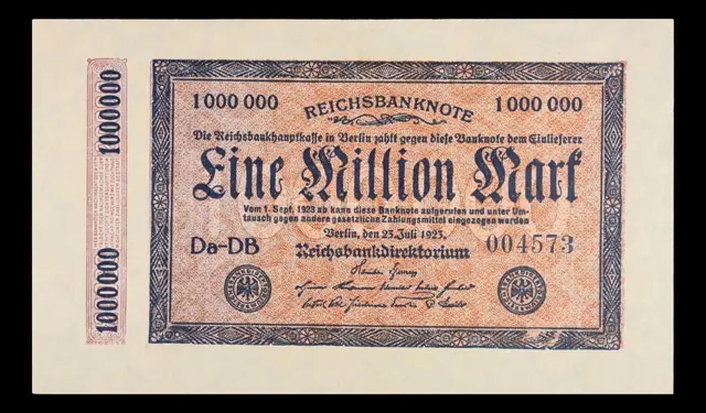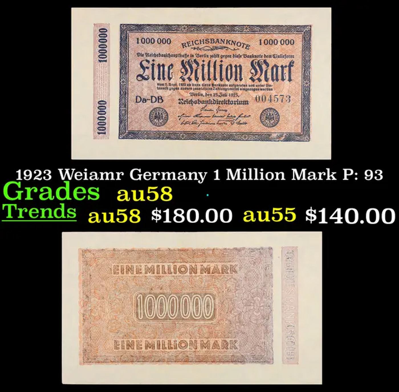 1923 Weimar Germany 1 Million Marks Note P: 93 Grades Choice AU/BU Slider. Notgeld is German for "emergency/necessity money". Notgeld typically refers to German and Austrian notes produced in the post-WWI period. Somewhat similar to Depression Scrip in the USA, these notes were issued when there wasn'te nough state-produced money available from the central bank. Issuing institutions were often a town's savings banks, municipalities, or private or state-owned firms. Nearly all issues contained an expiry date, after which time they were invalid. Issues without dates ordinarily had an expiry announced in a newspaper or at the place of issuance.