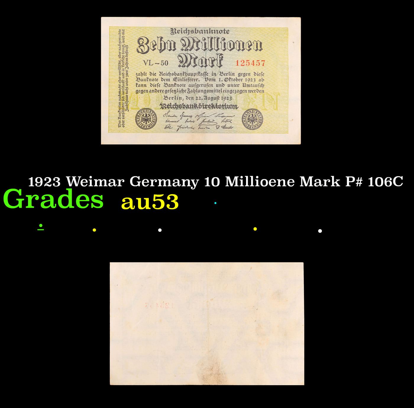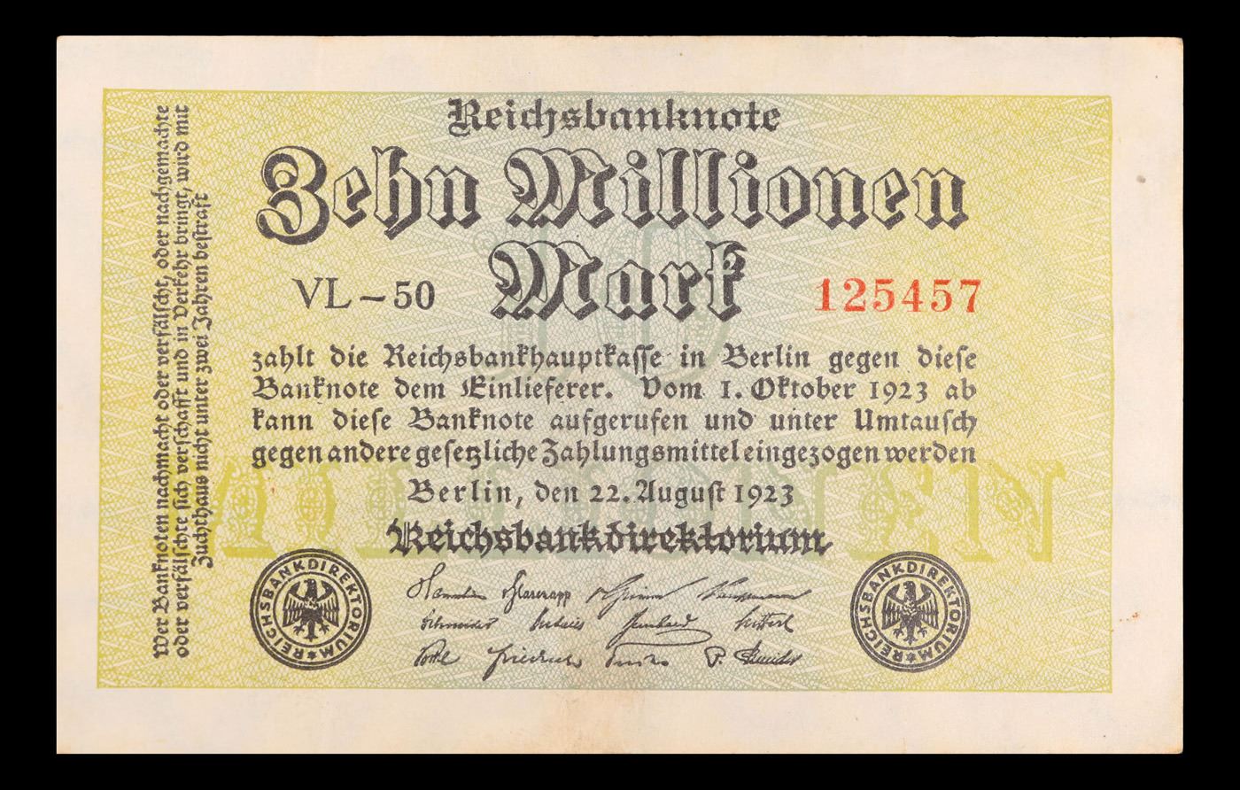 1923 Weimar Germany 10 Millioene Mark P# 106C Grades Select AU. In the early 1920s, post-WWI Germany saw its economy spiraling out of control. Hyperinflation started directly after the war in 1918, but truly took over the Weimar Republic from 1921 to 1923. The value of the Mark declined incredibly rapidly. 1 USD was equal to 50 German Marks at the beginning of 1920. Toward the end of 1923, 1 USD was equal to over 4,200,000,000,000 German Marks. At times, denominations of the Mark became less valuable than the paper and labor to print it almost immediately after printing. Thus, denominations of the Mark notes became incredibly large, ending up in the tens of trillions.