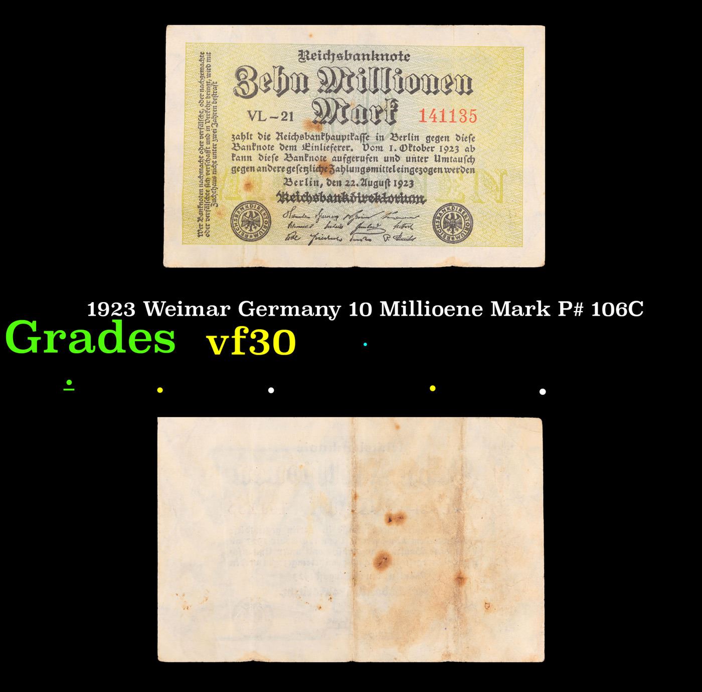 1923 Weimar Germany 10 Millioene Mark P# 106C Grades vf++. In the early 1920s, post-WWI Germany saw its economy spiraling out of control. Hyperinflation started directly after the war in 1918, but truly took over the Weimar Republic from 1921 to 1923. The value of the Mark declined incredibly rapidly. 1 USD was equal to 50 German Marks at the beginning of 1920. Toward the end of 1923, 1 USD was equal to over 4,200,000,000,000 German Marks. At times, denominations of the Mark became less valuable than the paper and labor to print it almost immediately after printing. Thus, denominations of the Mark notes became incredibly large, ending up in the tens of trillions.