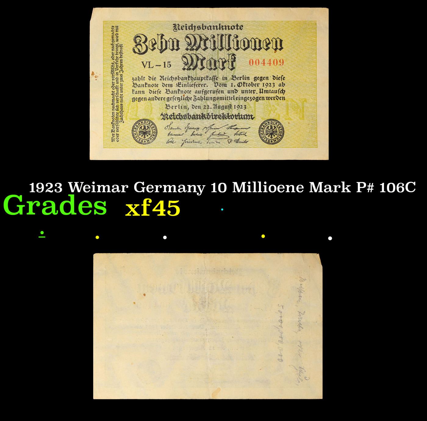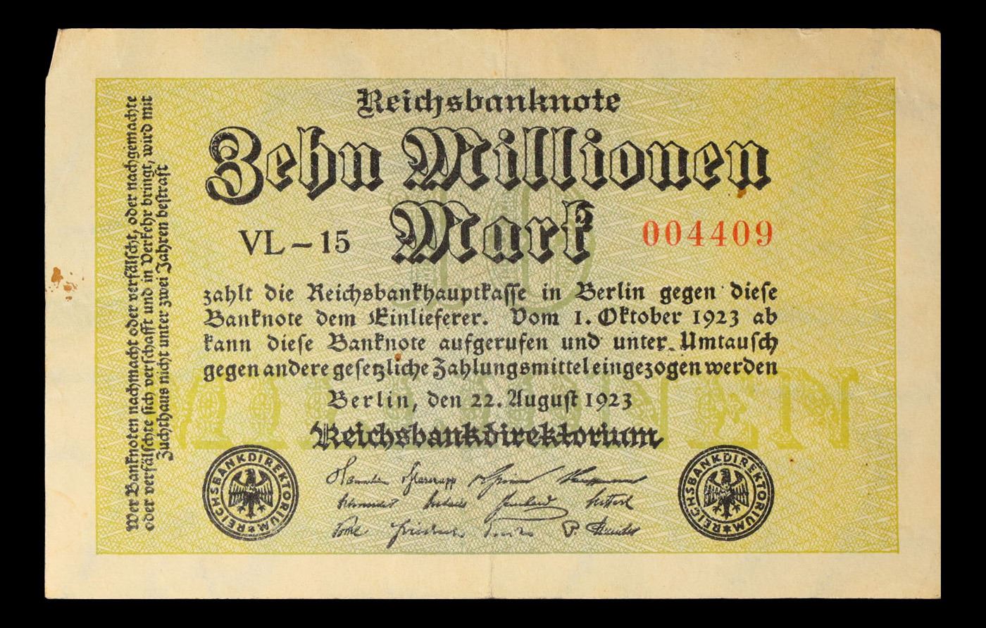 1923 Weimar Germany 10 Millioene Mark P# 106C Grades xf+. In the early 1920s, post-WWI Germany saw its economy spiraling out of control. Hyperinflation started directly after the war in 1918, but truly took over the Weimar Republic from 1921 to 1923. The value of the Mark declined incredibly rapidly. 1 USD was equal to 50 German Marks at the beginning of 1920. Toward the end of 1923, 1 USD was equal to over 4,200,000,000,000 German Marks. At times, denominations of the Mark became less valuable than the paper and labor to print it almost immediately after printing. Thus, denominations of the Mark notes became incredibly large, ending up in the tens of trillions.