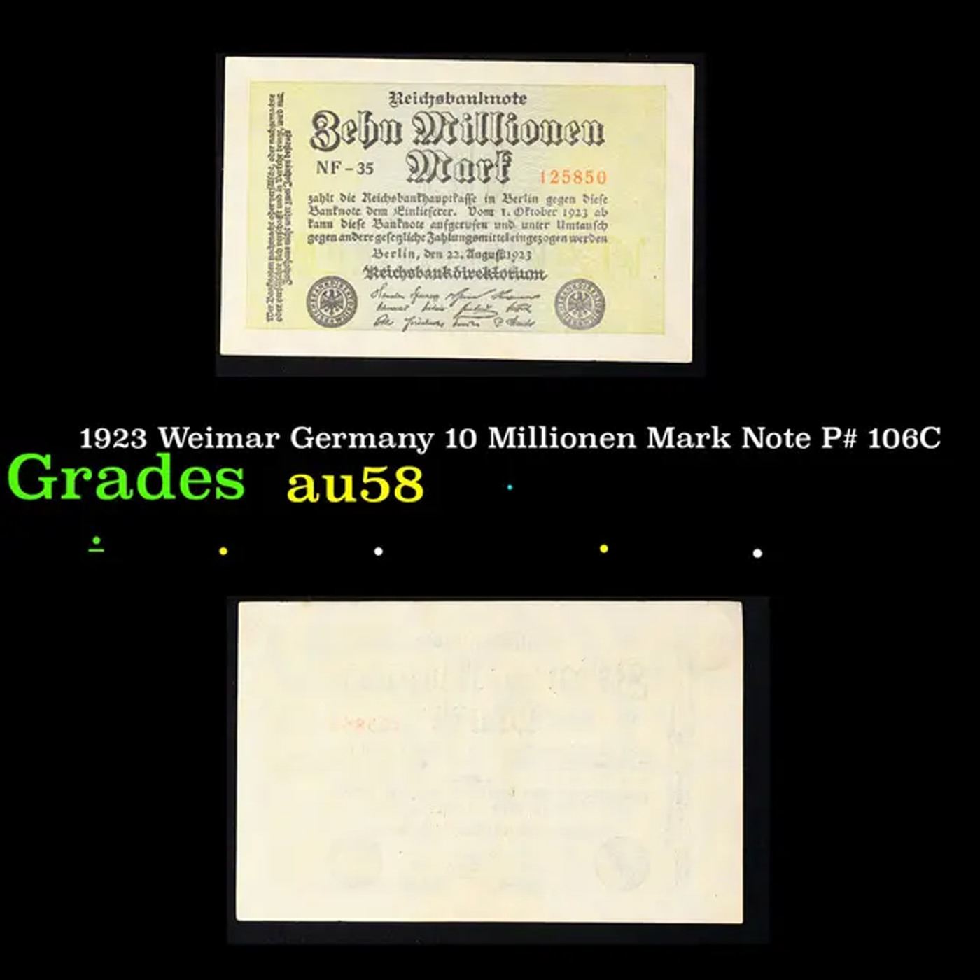 1923 Weimar Germany 10 Millionen Mark Note P# 106C Grades Choice AU/BU Slider