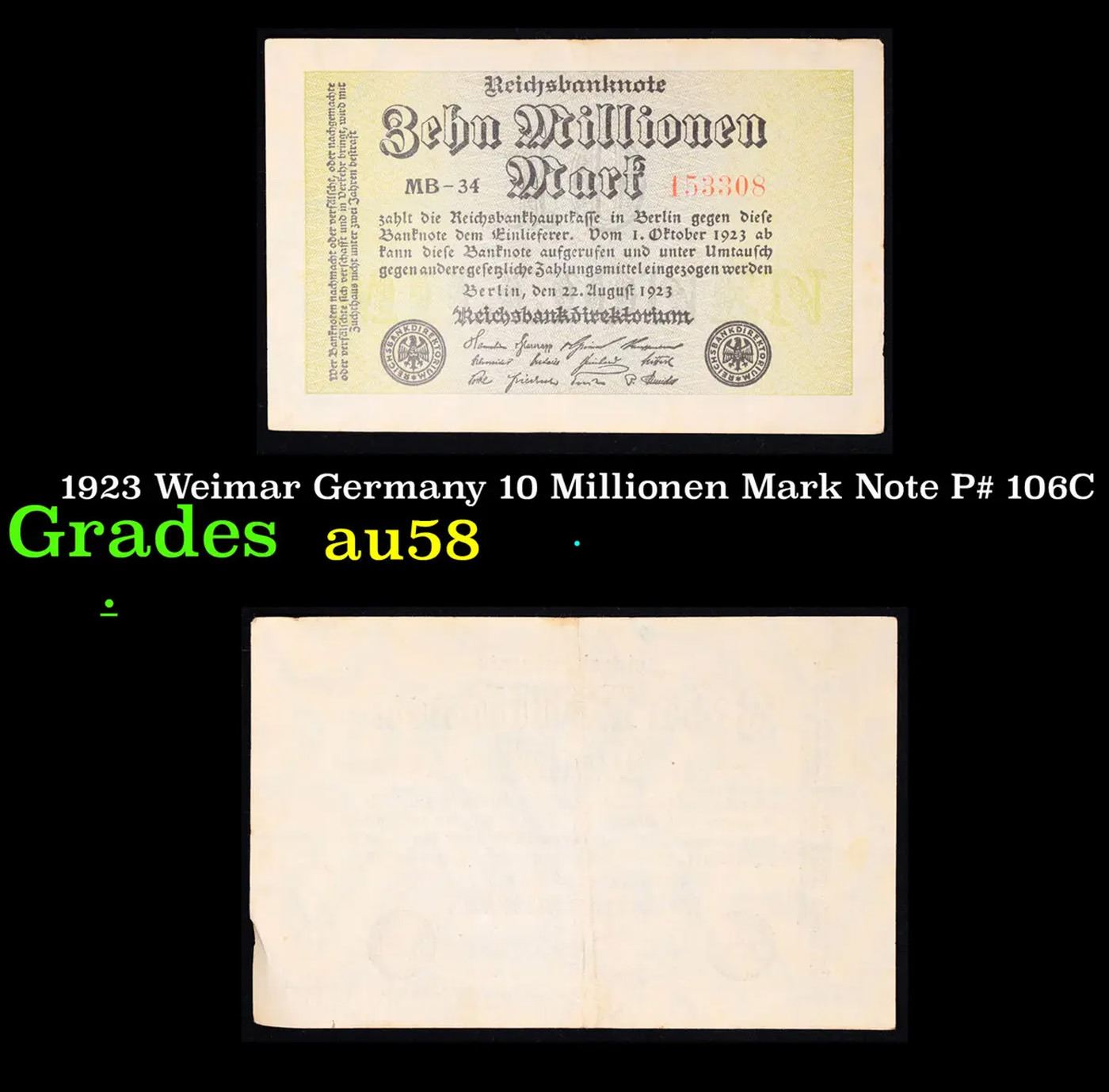1923 Weimar Germany 10 Millionen Mark Note P# 106C Grades Choice AU/BU Slider. Notgeld is German for "emergency/necessity money". Notgeld typically refers to German and Austrian notes produced in the post-WWI period. Somewhat similar to Depression Scrip in the USA, these notes were issued when there wasn'te nough state-produced money available from the central bank. Issuing institutions were often a town's savings banks, municipalities, or private or state-owned firms. Nearly all issues contained an expiry date, after which time they were invalid. Issues without dates ordinarily had an expiry announced in a newspaper or at the place of issuance.