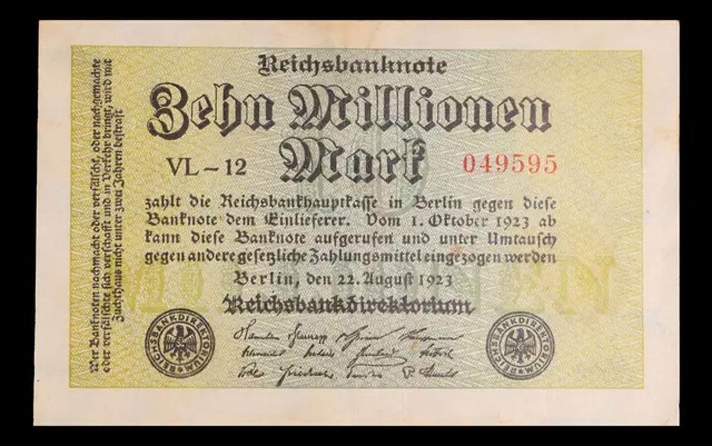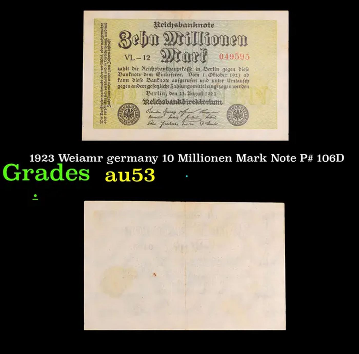 1923 Weimar Germany 10 Millionen Mark Note P# 106D Grades Select AU. In the early 1920s, post-WWI Germany saw its economy spiraling out of control. Hyperinflation started directly after the war in 1918, but truly took over the Weimar Republic from 1921 to 1923. The value of the Mark declined incredibly rapidly. 1 USD was equal to 50 German Marks at the beginning of 1920. Toward the end of 1923, 1 USD was equal to over 4,200,000,000,000 German Marks. At times, denominations of the Mark became less valuable than the paper and labor to print it almost immediately after printing. Thus, denominations of the Mark notes became incredibly large, ending up in the tens of trillions.