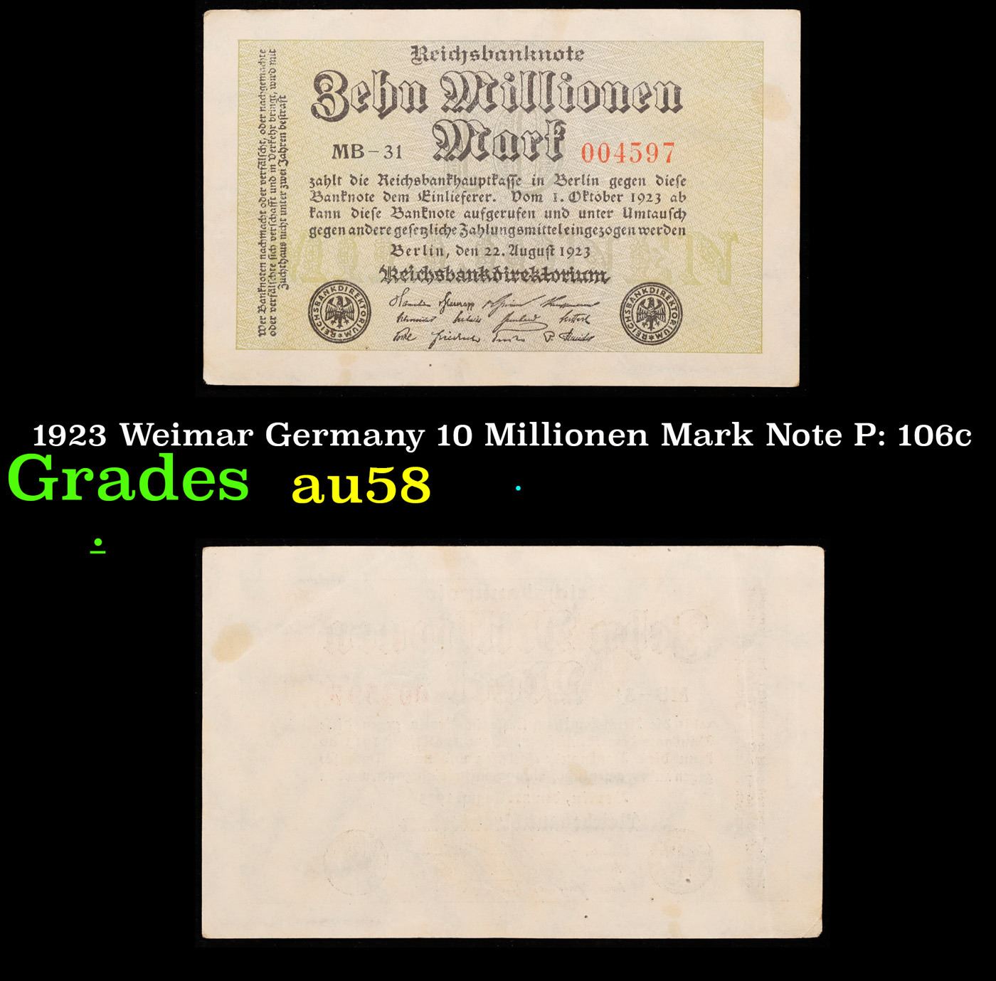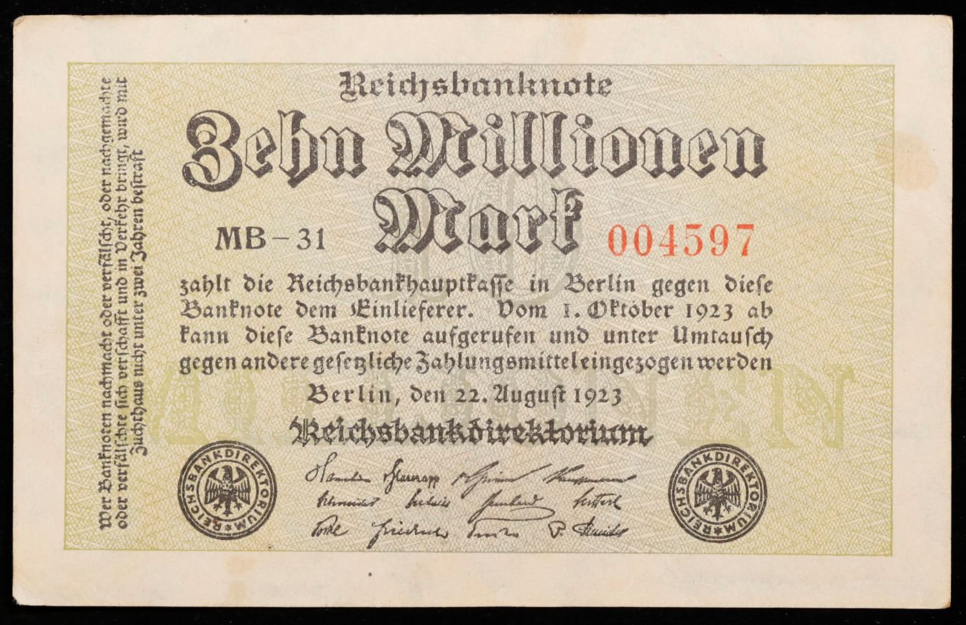 1923 Weimar Germany 10 Millionen Mark Note P: 106c Grades Choice AU/BU Slider. In the early 1920s, post-WWI Germany saw its economy spiraling out of control. Hyperinflation started directly after the war in 1918, but truly took over the Weimar Republic from 1921 to 1923. The value of the Mark declined incredibly rapidly. 1 USD was equal to 50 German Marks at the beginning of 1920. Toward the end of 1923, 1 USD was equal to over 4,200,000,000,000 German Marks. At times, denominations of the Mark became less valuable than the paper and labor to print it almost immediately after printing. Thus, denominations of the Mark notes became incredibly large, ending up in the tens of trillions.