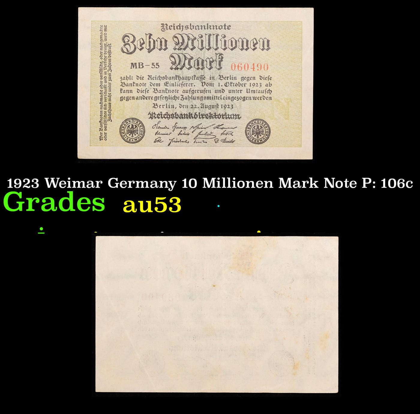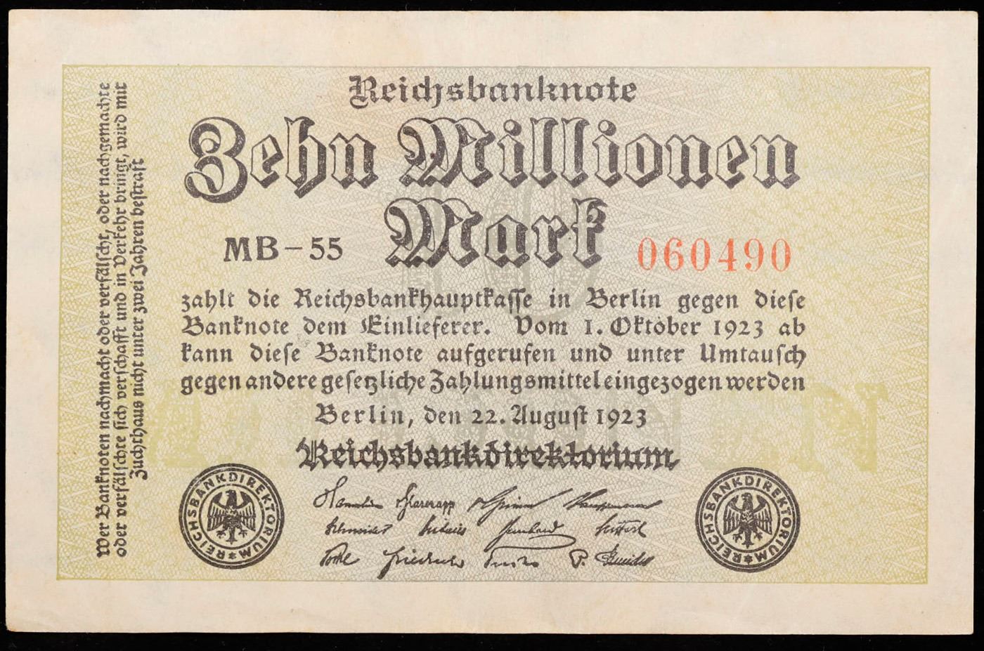 1923 Weimar Germany 10 Millionen Mark Note P: 106c Grades Select AU. In the early 1920s, post-WWI Germany saw its economy spiraling out of control. Hyperinflation started directly after the war in 1918, but truly took over the Weimar Republic from 1921 to 1923. The value of the Mark declined incredibly rapidly. 1 USD was equal to 50 German Marks at the beginning of 1920. Toward the end of 1923, 1 USD was equal to over 4,200,000,000,000 German Marks. At times, denominations of the Mark became less valuable than the paper and labor to print it almost immediately after printing. Thus, denominations of the Mark notes became incredibly large, ending up in the tens of trillions.