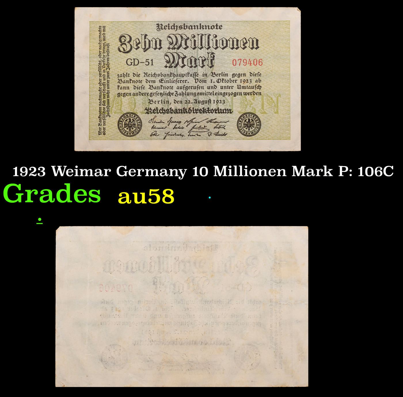 1923 Weimar Germany 10 Millionen Mark P: 106C Grades Choice AU/BU Slider. In the early 1920s, post-WWI Germany saw its economy spiraling out of control. Hyperinflation started directly after the war in 1918, but truly took over the Weimar Republic from 1921 to 1923. The value of the Mark declined incredibly rapidly. 1 USD was equal to 50 German Marks at the beginning of 1920. Toward the end of 1923, 1 USD was equal to over 4,200,000,000,000 German Marks. At times, denominations of the Mark became less valuable than the paper and labor to print it almost immediately after printing. Thus, denominations of the Mark notes became incredibly large, ending up in the tens of trillions.