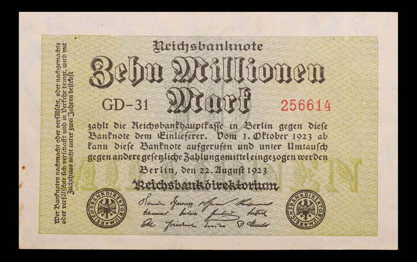 1923 Weimar Germany 10 Millionen Mark P: 106C Grades Select CU. In the early 1920s, post-WWI Germany saw its economy spiraling out of control. Hyperinflation started directly after the war in 1918, but truly took over the Weimar Republic from 1921 to 1923. The value of the Mark declined incredibly rapidly. 1 USD was equal to 50 German Marks at the beginning of 1920. Toward the end of 1923, 1 USD was equal to over 4,200,000,000,000 German Marks. At times, denominations of the Mark became less valuable than the paper and labor to print it almost immediately after printing. Thus, denominations of the Mark notes became incredibly large, ending up in the tens of trillions.