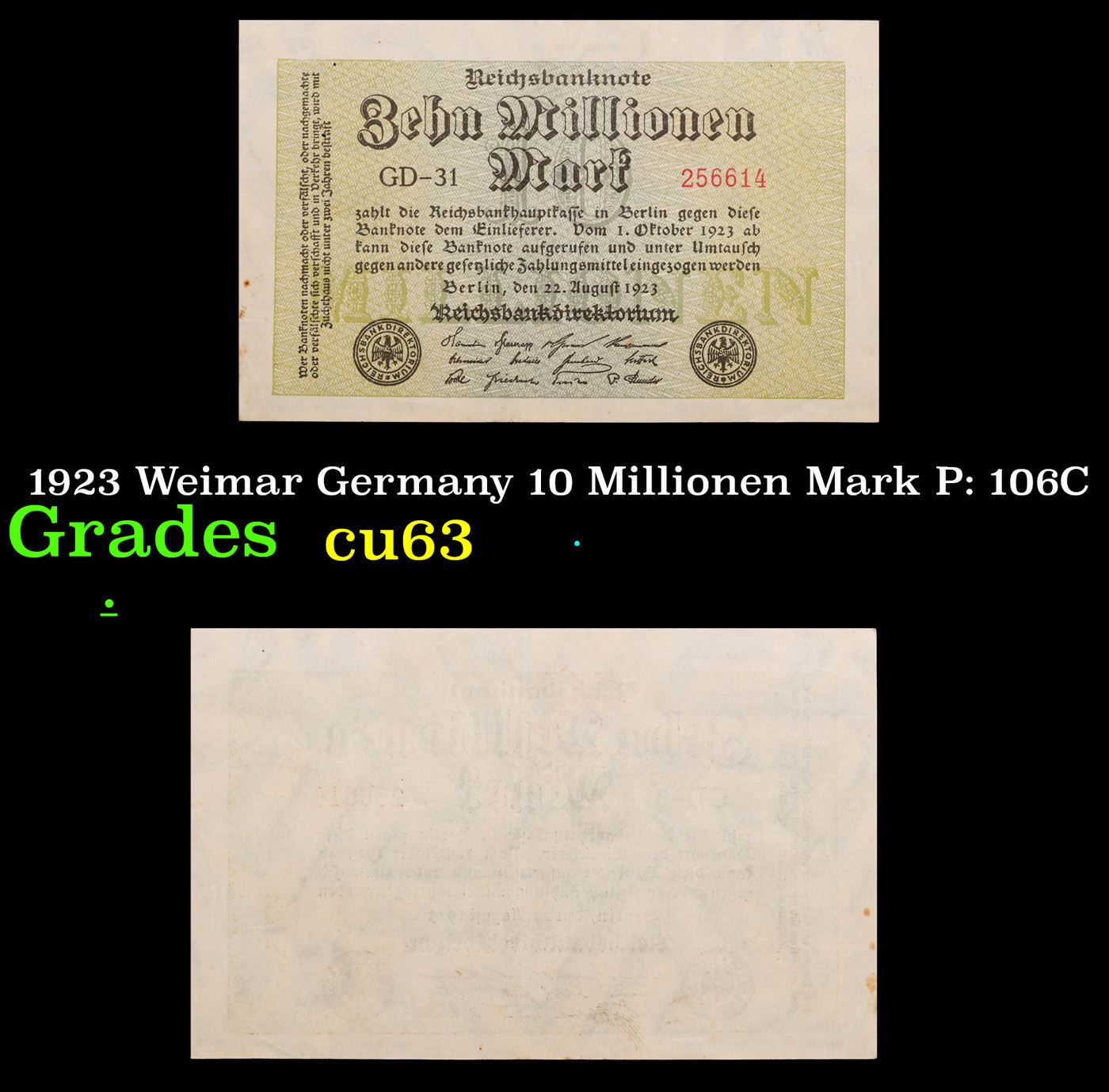 1923 Weimar Germany 10 Millionen Mark P: 106C Grades Select CU. In the early 1920s, post-WWI Germany saw its economy spiraling out of control. Hyperinflation started directly after the war in 1918, but truly took over the Weimar Republic from 1921 to 1923. The value of the Mark declined incredibly rapidly. 1 USD was equal to 50 German Marks at the beginning of 1920. Toward the end of 1923, 1 USD was equal to over 4,200,000,000,000 German Marks. At times, denominations of the Mark became less valuable than the paper and labor to print it almost immediately after printing. Thus, denominations of the Mark notes became incredibly large, ending up in the tens of trillions.