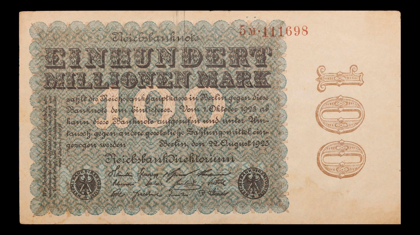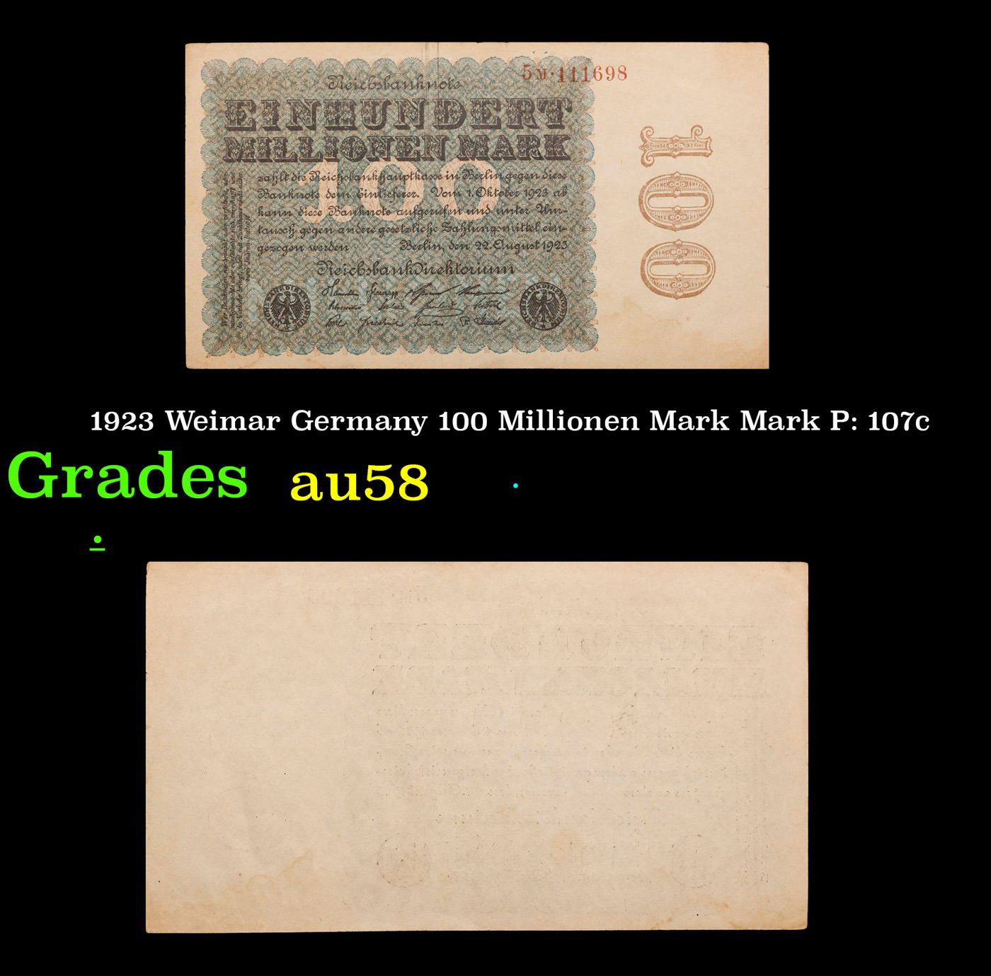 1923 Weimar Germany 100 Millionen Mark Mark P: 107c Grades Choice AU/BU Slider.