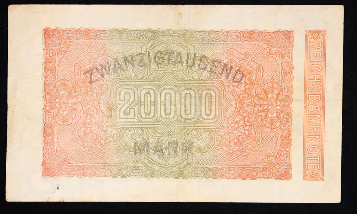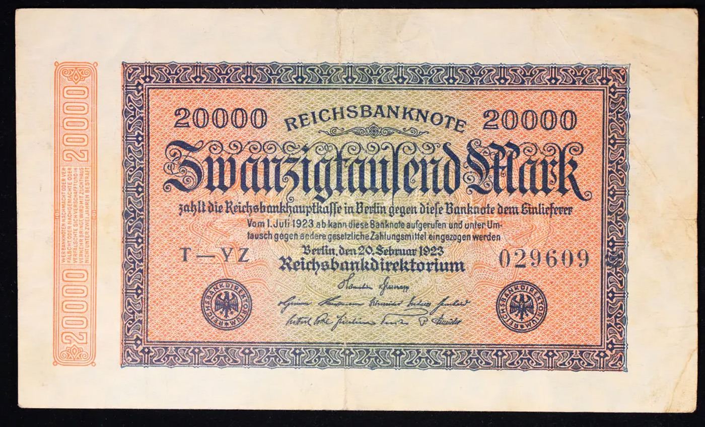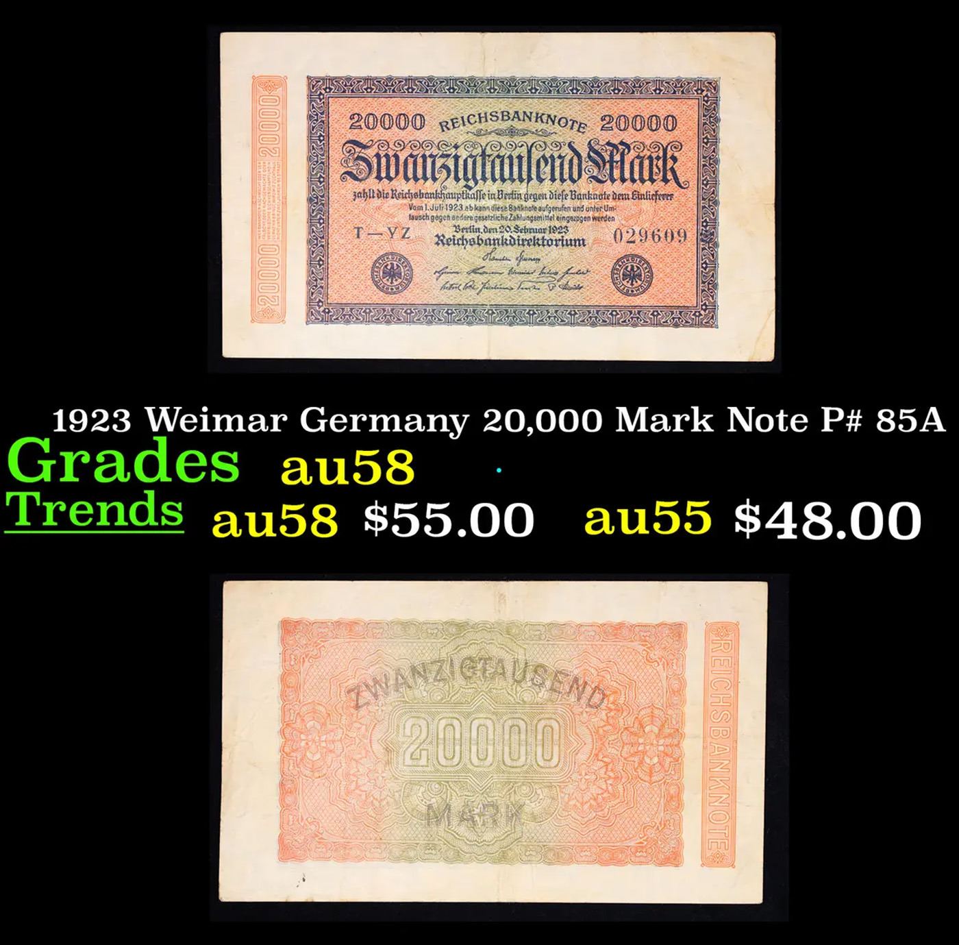 1923 Weimar Germany 20,000 Mark Note P# 85A Grades Choice AU/BU Slider. In the early 1920s, post-WWI Germany saw its economy spiraling out of control. Hyperinflation started directly after the war in 1918, but truly took over the Weimar Republic from 1921 to 1923. The value of the Mark declined incredibly rapidly. 1 USD was equal to 50 German Marks at the beginning of 1920. Toward the end of 1923, 1 USD was equal to over 4,200,000,000,000 German Marks. At times, denominations of the Mark became less valuable than the paper and labor to print it almost immediately after printing. Thus, denominations of the Mark notes became incredibly large, ending up in the tens of trillions.