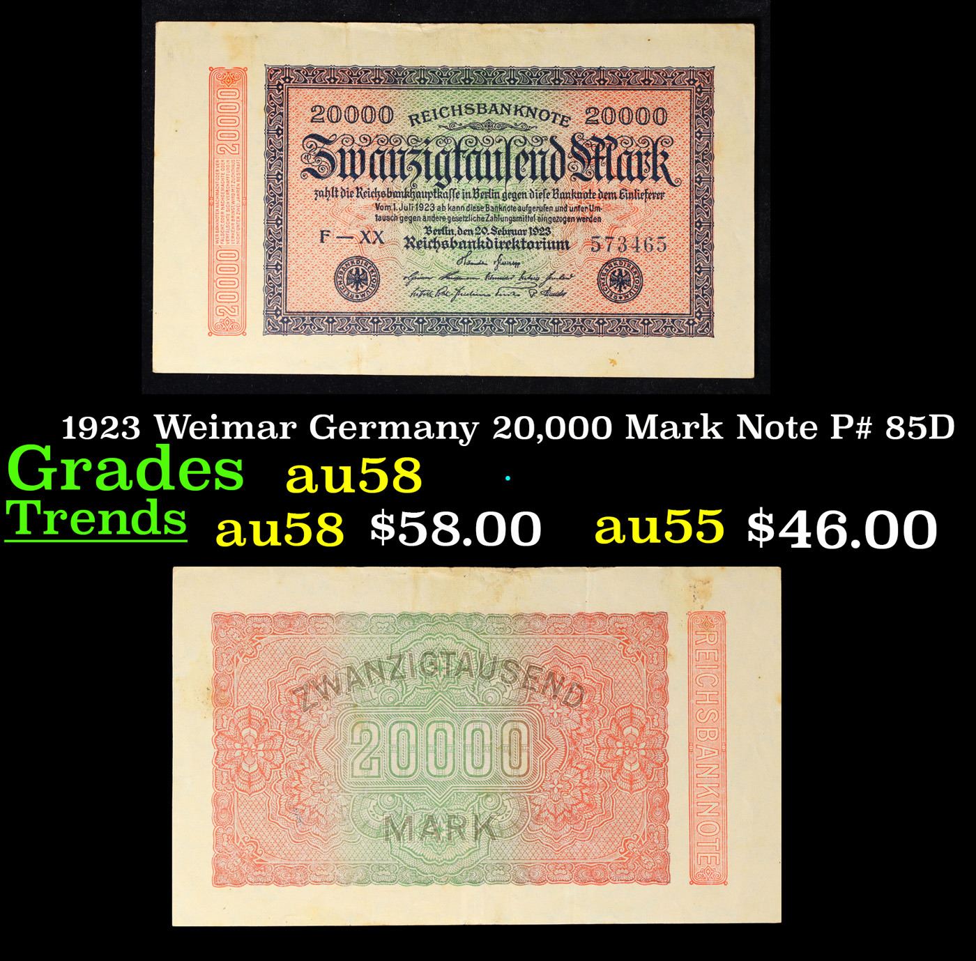 1923 Weimar Germany 20,000 Mark Note P# 85D Grades Choice AU/BU Slider