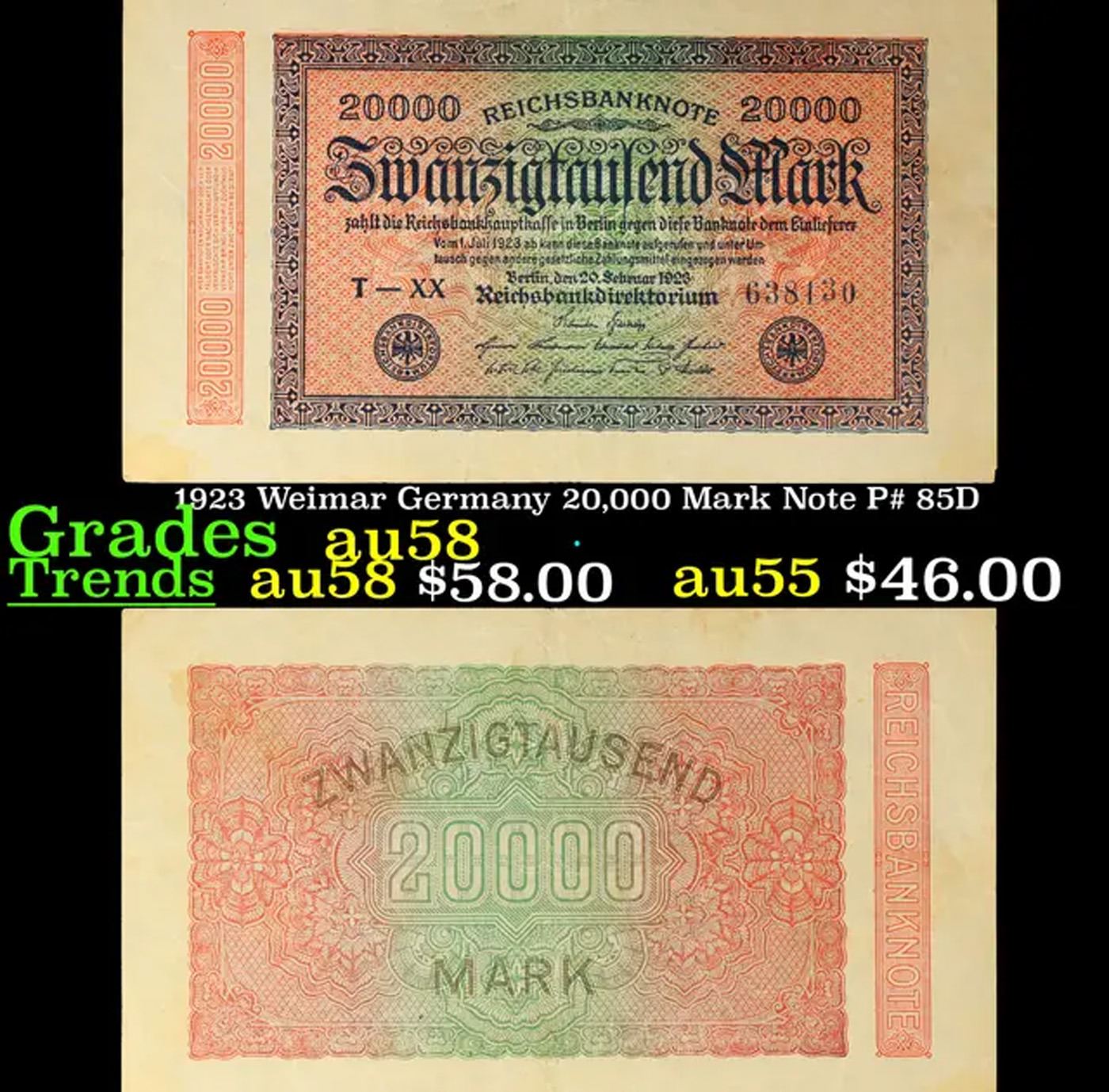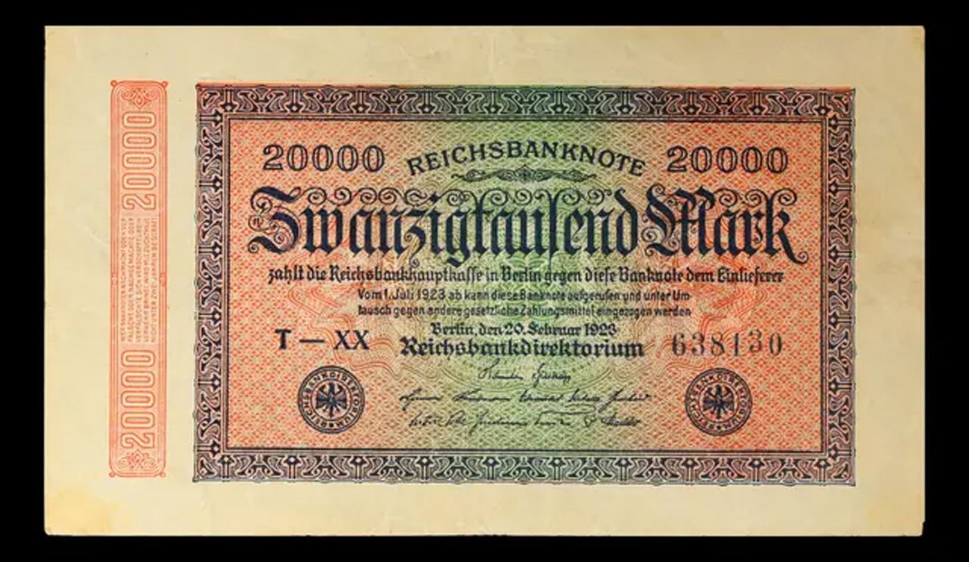 1923 Weimar Germany 20,000 Mark Note P# 85D Grades Choice AU/BU Slider. In the early 1920s, post-WWI Germany saw its economy spiraling out of control. Hyperinflation started directly after the war in 1918, but truly took over the Weimar Republic from 1921 to 1923. The value of the Mark declined incredibly rapidly. 1 USD was equal to 50 German Marks at the beginning of 1920. Toward the end of 1923, 1 USD was equal to over 4,200,000,000,000 German Marks. At times, denominations of the Mark became less valuable than the paper and labor to print it almost immediately after printing. Thus, denominations of the Mark notes became incredibly large, ending up in the tens of trillions.