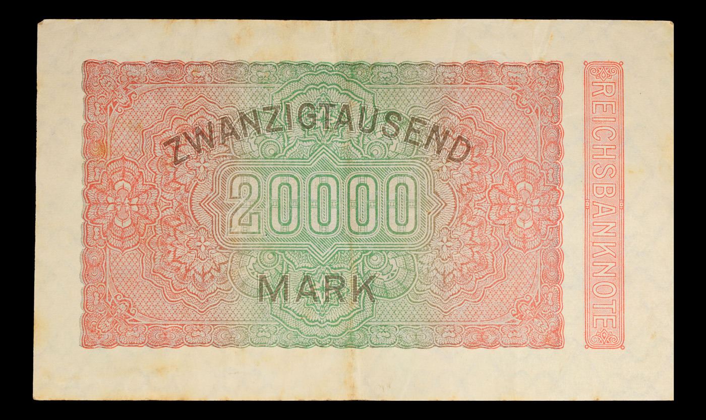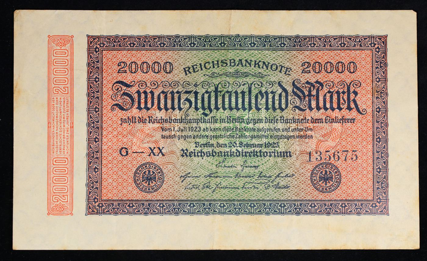 1923 Weimar Germany 20,000 Mark Note P# 85D Grades vf++. In the early 1920s, post-WWI Germany saw its economy spiraling out of control. Hyperinflation started directly after the war in 1918, but truly took over the Weimar Republic from 1921 to 1923. The value of the Mark declined incredibly rapidly. 1 USD was equal to 50 German Marks at the beginning of 1920. Toward the end of 1923, 1 USD was equal to over 4,200,000,000,000 German Marks. At times, denominations of the Mark became less valuable than the paper and labor to print it almost immediately after printing. Thus, denominations of the Mark notes became incredibly large, ending up in the tens of trillions.