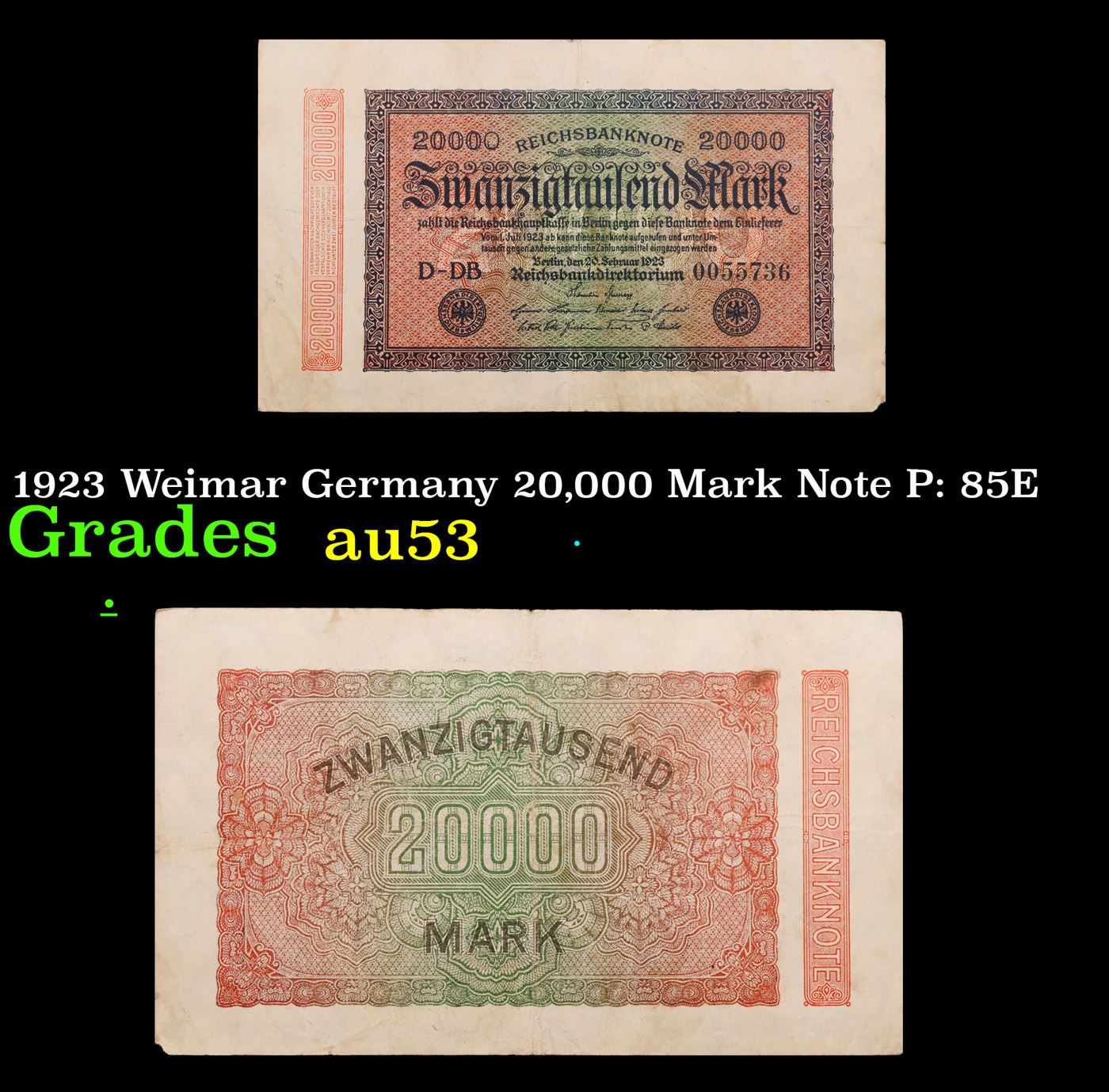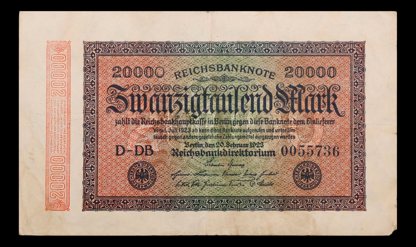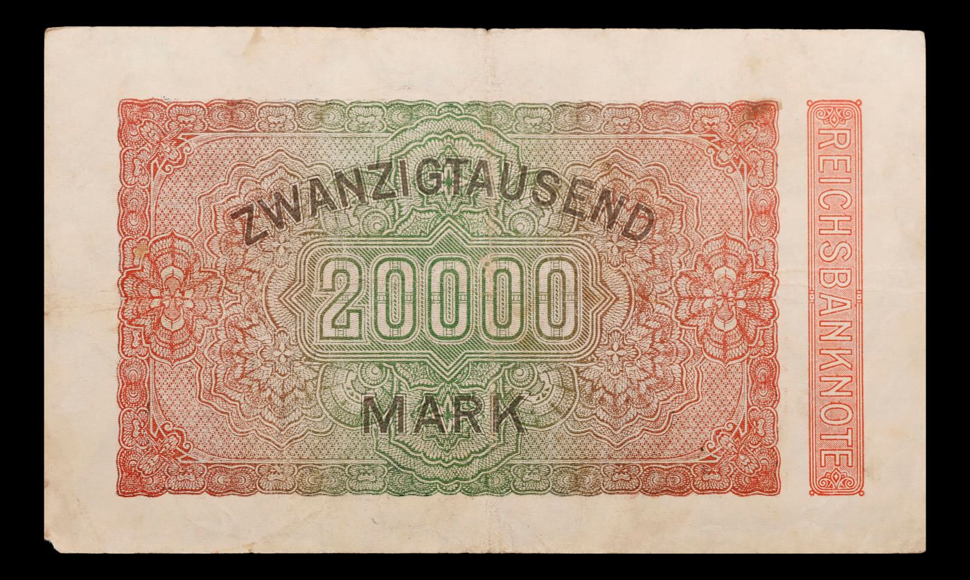 1923 Weimar Germany 20,000 Mark Note P: 85E Grades Select AU. In the early 1920s, post-WWI Germany saw its economy spiraling out of control. Hyperinflation started directly after the war in 1918, but truly took over the Weimar Republic from 1921 to 1923. The value of the Mark declined incredibly rapidly. 1 USD was equal to 50 German Marks at the beginning of 1920. Toward the end of 1923, 1 USD was equal to over 4,200,000,000,000 German Marks. At times, denominations of the Mark became less valuable than the paper and labor to print it almost immediately after printing. Thus, denominations of the Mark notes became incredibly large, ending up in the tens of trillions.