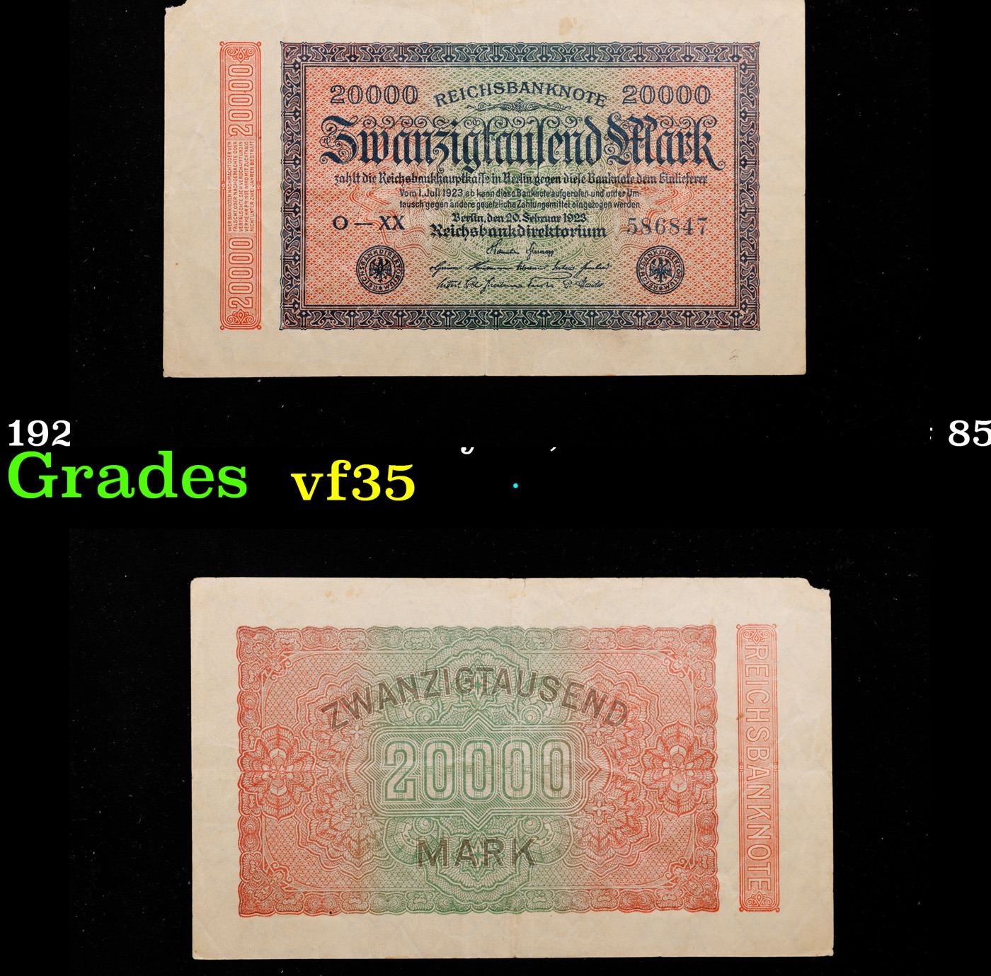 1923 Weimar Germany 20,000 Mark Note P# 85E Grades vf++