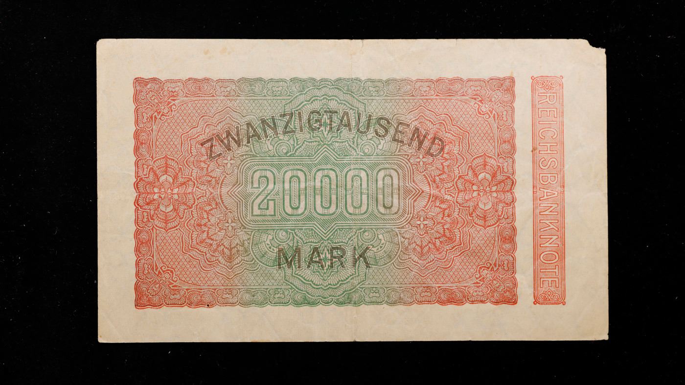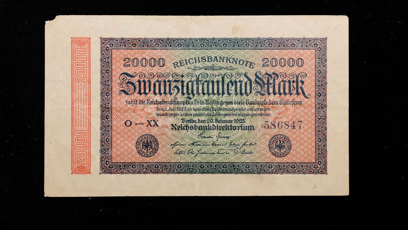 1923 Weimar Germany 20,000 Mark Note P# 85E Grades vf++. In the early 1920s, post-WWI Germany saw its economy spiraling out of control. Hyperinflation started directly after the war in 1918, but truly took over the Weimar Republic from 1921 to 1923. The value of the Mark declined incredibly rapidly. 1 USD was equal to 50 German Marks at the beginning of 1920. Toward the end of 1923, 1 USD was equal to over 4,200,000,000,000 German Marks. At times, denominations of the Mark became less valuable than the paper and labor to print it almost immediately after printing. Thus, denominations of the Mark notes became incredibly large, ending up in the tens of trillions.