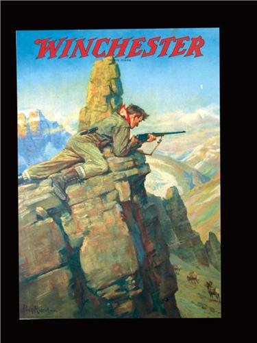 1923 Winchester Calendar Top, Phillip R. Goodwin artist. Depicting man on rock with gun overlooking a canyon. No band, excellent original condition. Framed and matted. 13 X 19 inches.