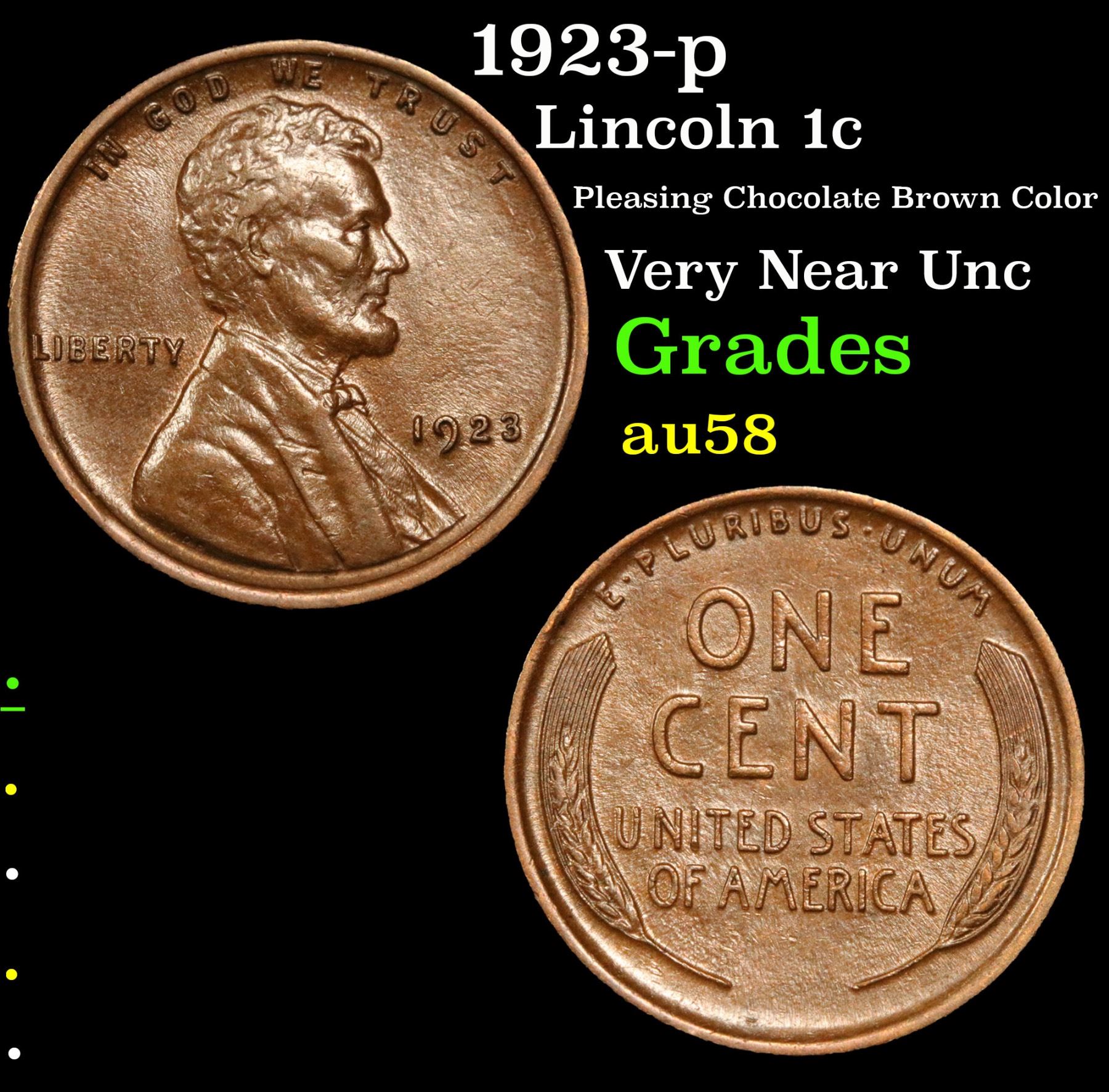 1923-p Lincoln Cent 1c Grades Choice AU/BU Slider. Pleasing Chocolate Brown Color Very Near Unc Out of an original mintage of over 74 million, PCGS estimates only 1200 survive in ms65 or better.