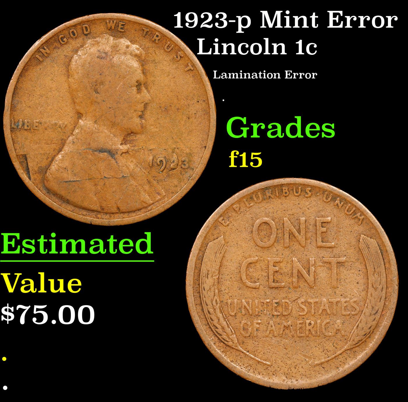1923-p Mint Error Lincoln Cent 1c Grades f+.