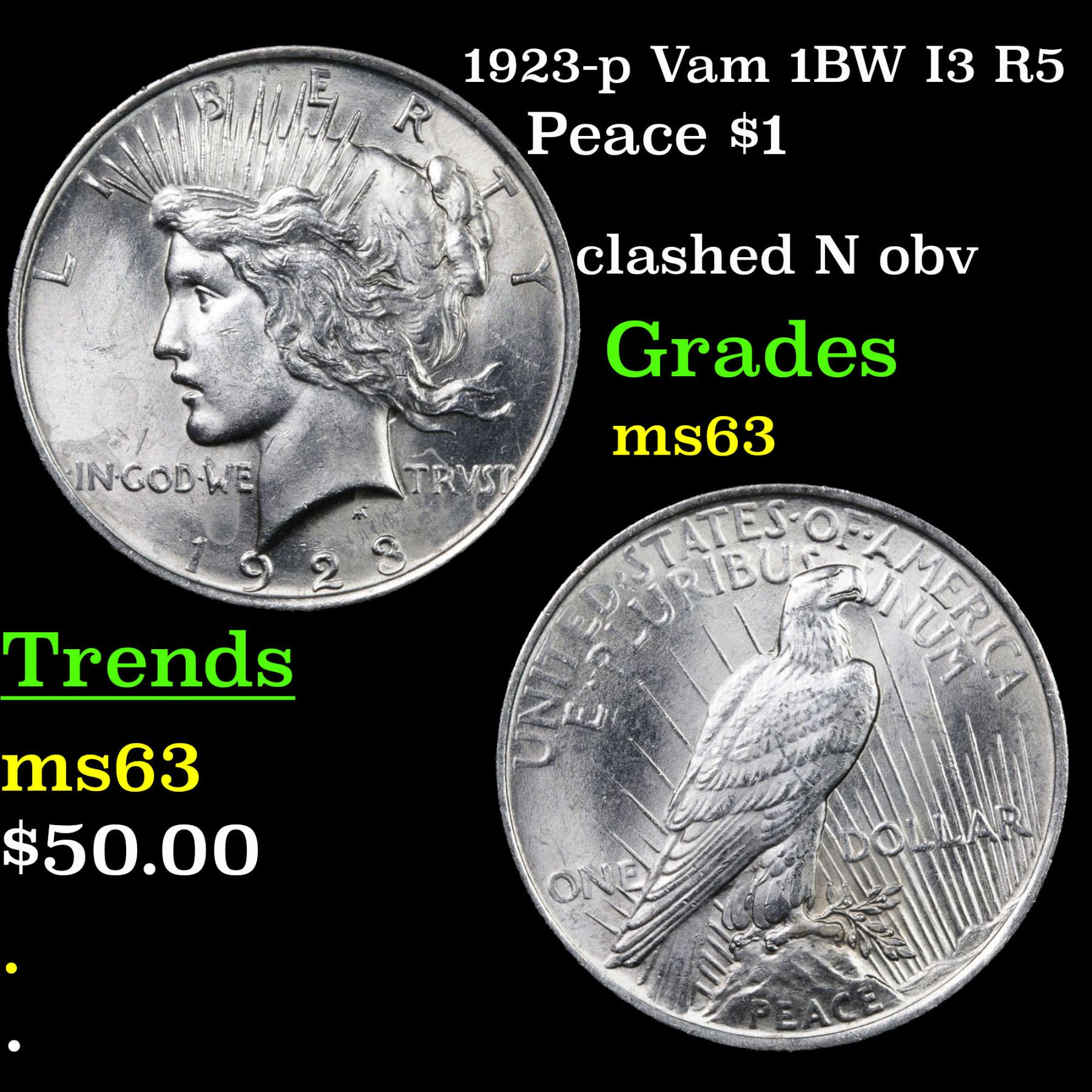 1923-p Vam 1BW I3 R5 Peace Dollar $1 Grades Select Unc.