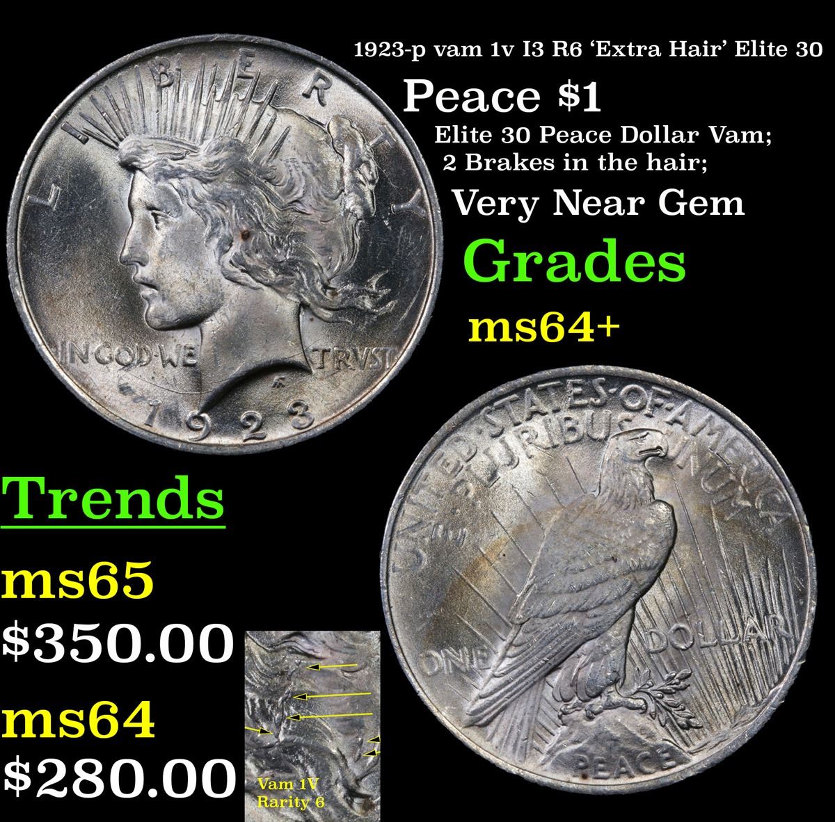 1923-p vam 1v I3 R6 'Extra Hair' Elite 30 Peace Dollar $1 Grades Choice+ Unc. Only Extra Hair Die Break That has 2 Brakes in the hair and not 1 A Corey's Pick
