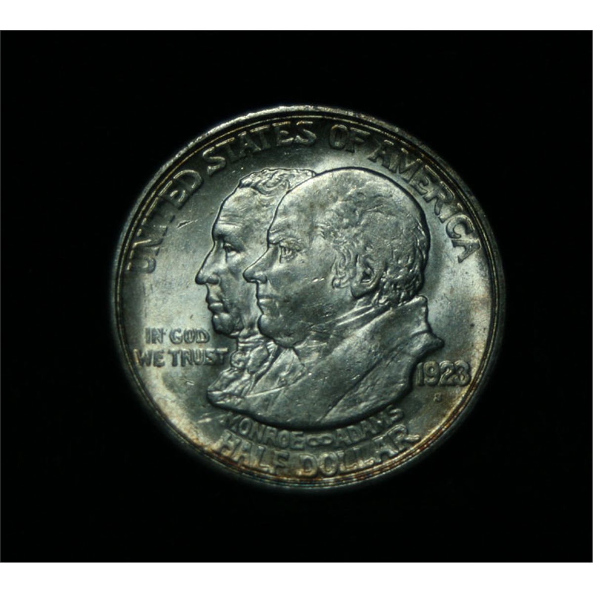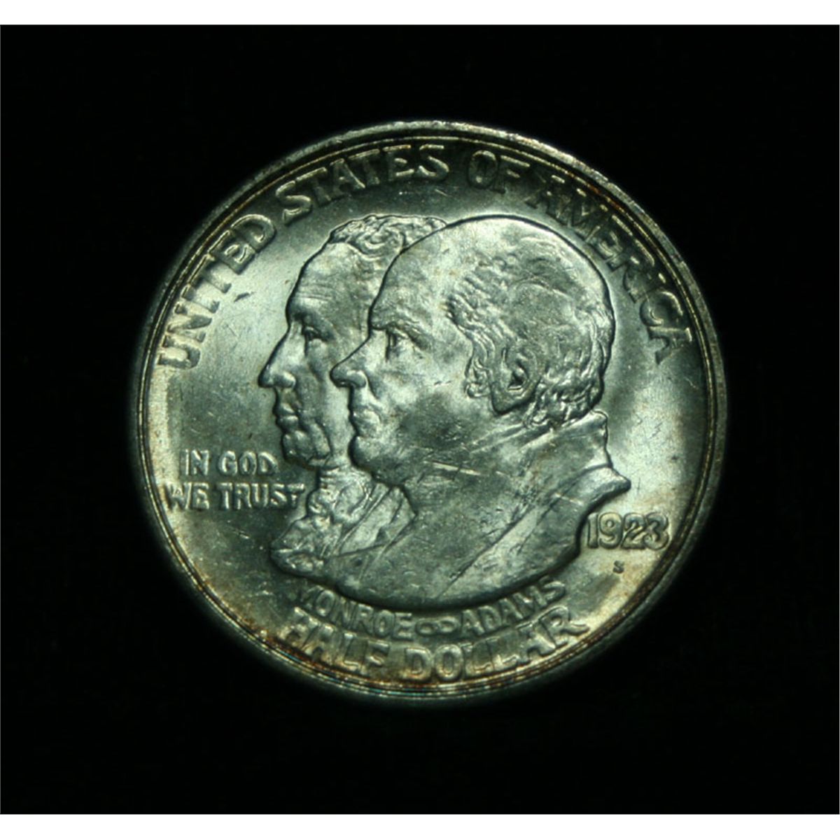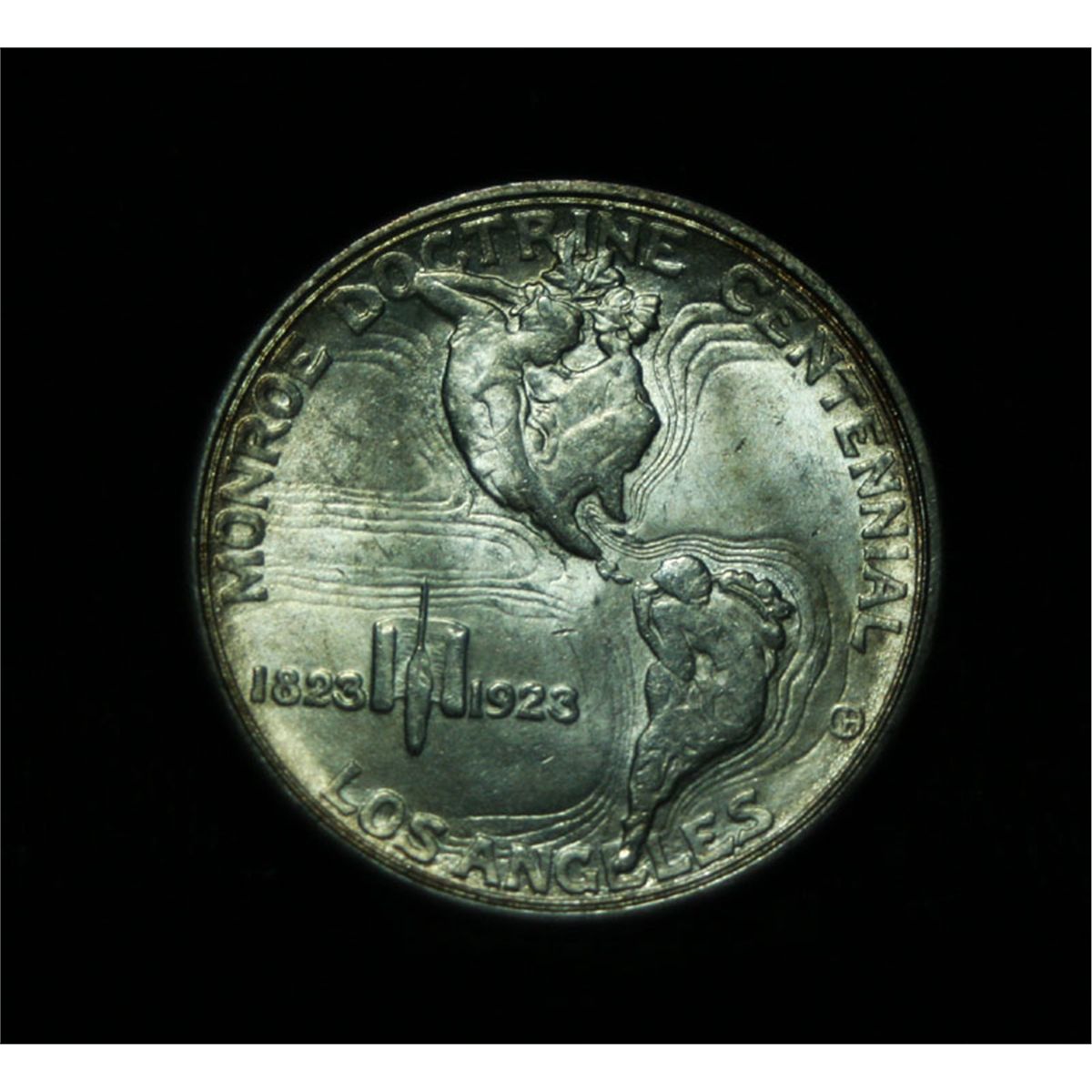 A Super Example, white with a great strike and blazing Luster, a few stray marks keep it from GEM. Its a shame, luster and strike like this not often seen on a Monroe, actually may get an ms64. One may think that the reverse is the two continents of The western Hemisphere but upon closer examination you will see that they are two women bent into the general shapes of the two continents. When examining a Monroe Commemorative the cheeks of the two statesmen on the obverse and the figures that represent the two continents on the reverse are the highpoints and will show wear first. NGC's Price Guide lists an ms63 at $120 and ms64 at $328. PCGS's Price Guide lists an ms63 at $160 and an ms64 at $425. The Wholesale Greysheet lists ms63 at $95 and ms64 at $185. Estimated Value $200